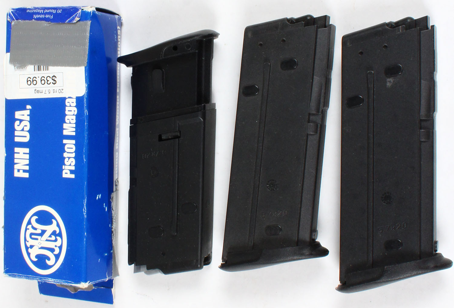 Lot of 3 hard plastic pistol mags., 5.7x28 cal., one has orignal box. Grade: Excellent - Value: 30 to 100