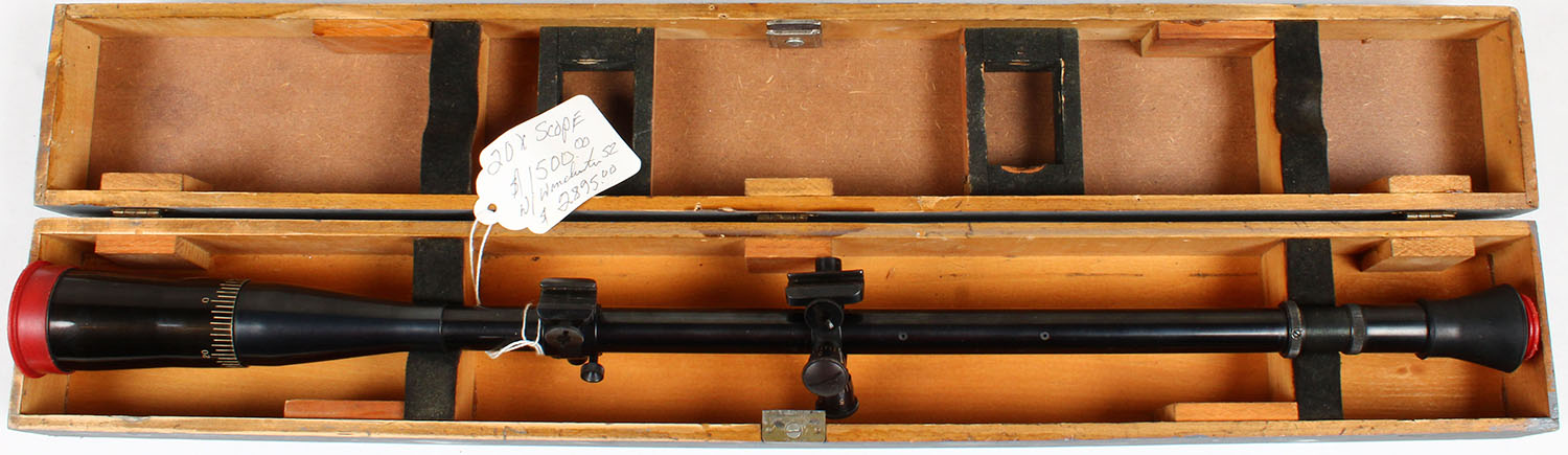 Lyman Targetspot long range scope, 20x, has mounts, has some rust posts and age soiling, hard to see reticle, somewhat blurry. Grade: Very Good ++ - Value: 500 to 1500