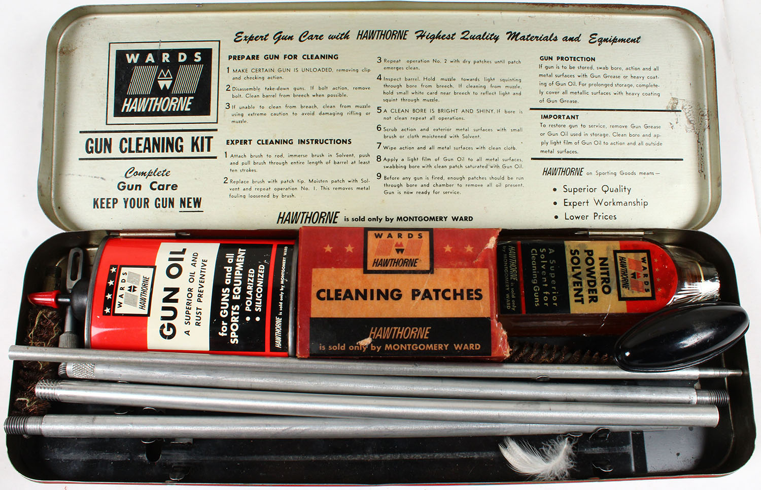 Wards Hawthorne Gun Cleaning kit, Full & Complete with oil tin, inside has age soiling. Grade: Very Good - Value: 10 to 40