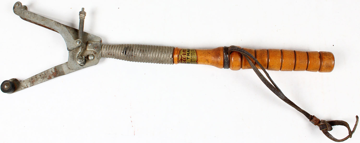 Western hand trap thrower, wood handle, has some rust. Grade: Very Good - Value: 10 to 40