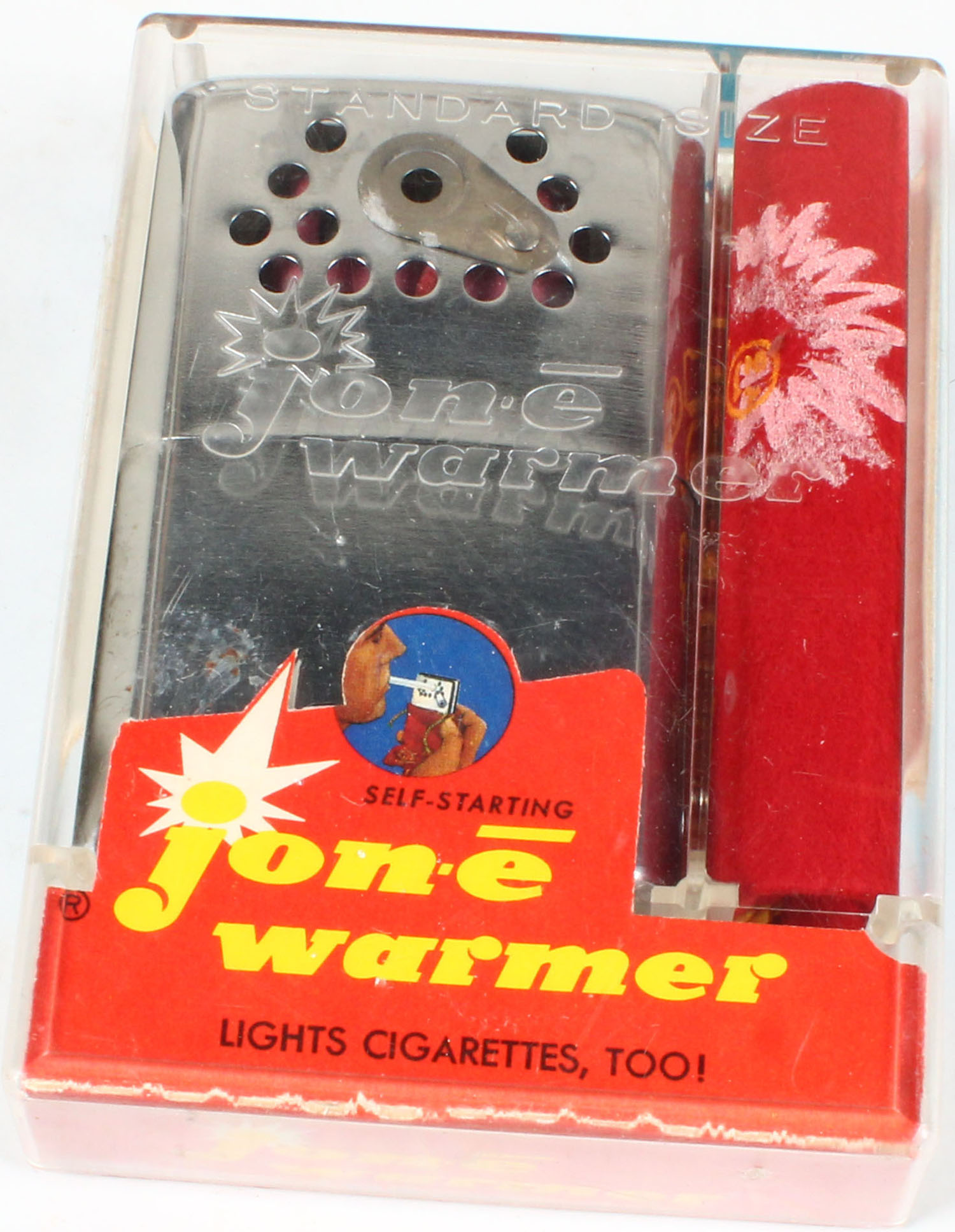 Jon-e Warmer for keeping you warm and lights cigarettes, in original box. Grade: Excellent - Value: 6 to 40