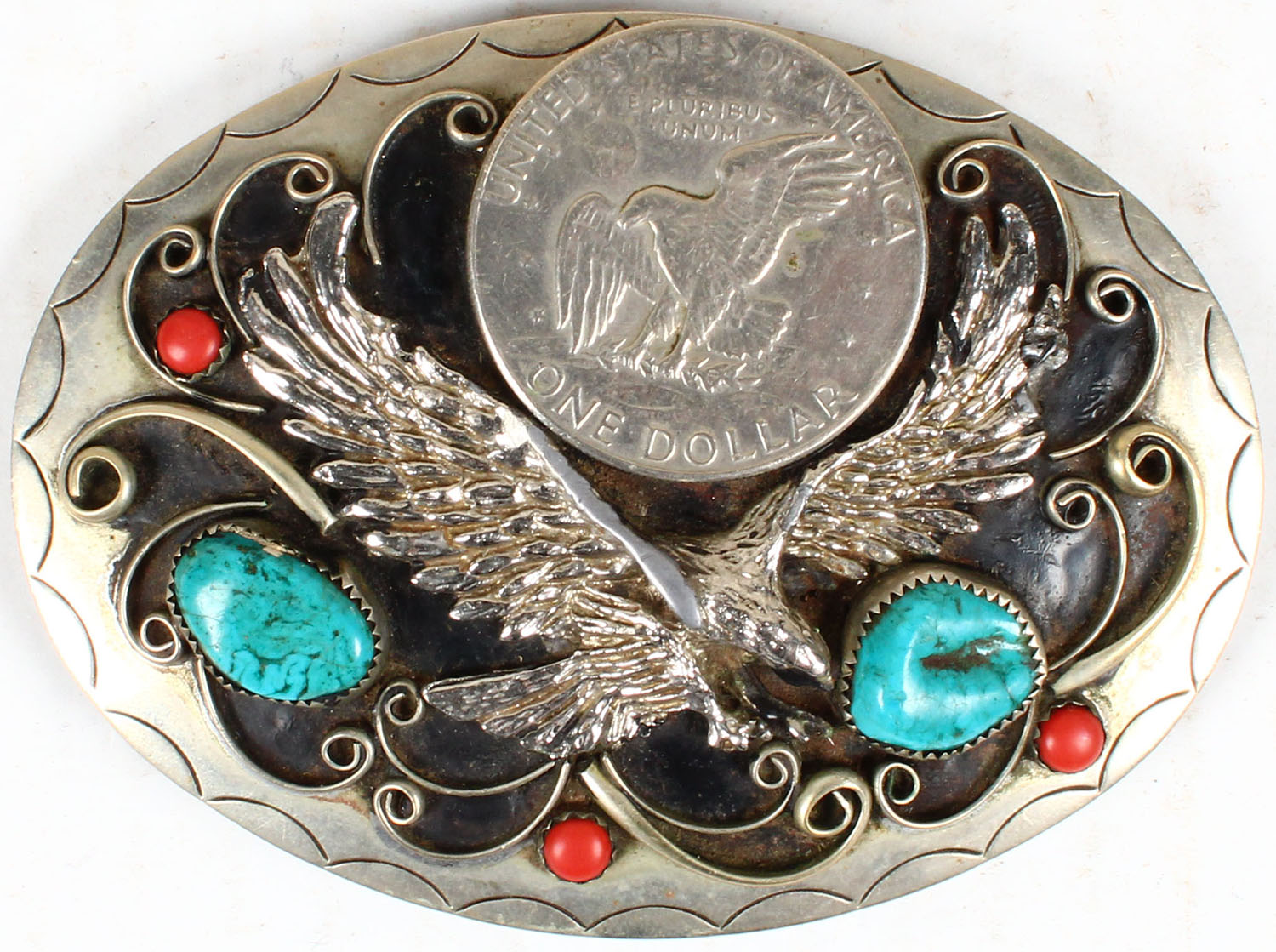 Large Navaho German Silver belt buckle with nice turquoise and red coral stones, nice eagles and 1970 era one dollar coin, great silver work. Grade: Excellent - Value: 100 to 400