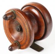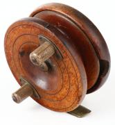 Unmarked wood/brass fly reel, English circa 1890's, dual handle... |