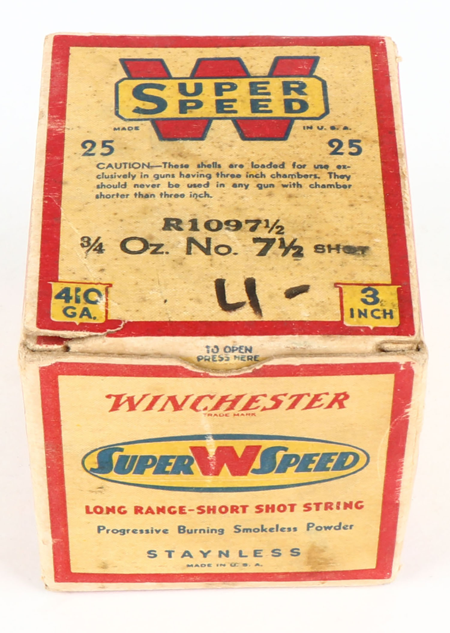 Winchester, Super W Speed, 410ga., Staynless, 3'', 1pc., Full, shot size 7 1/2, cream, red, blue and yellow box, box is very solid with great colors, has light age soiling, paper shells are very good. Grade: Very Good ++ - Value: 20 to 60