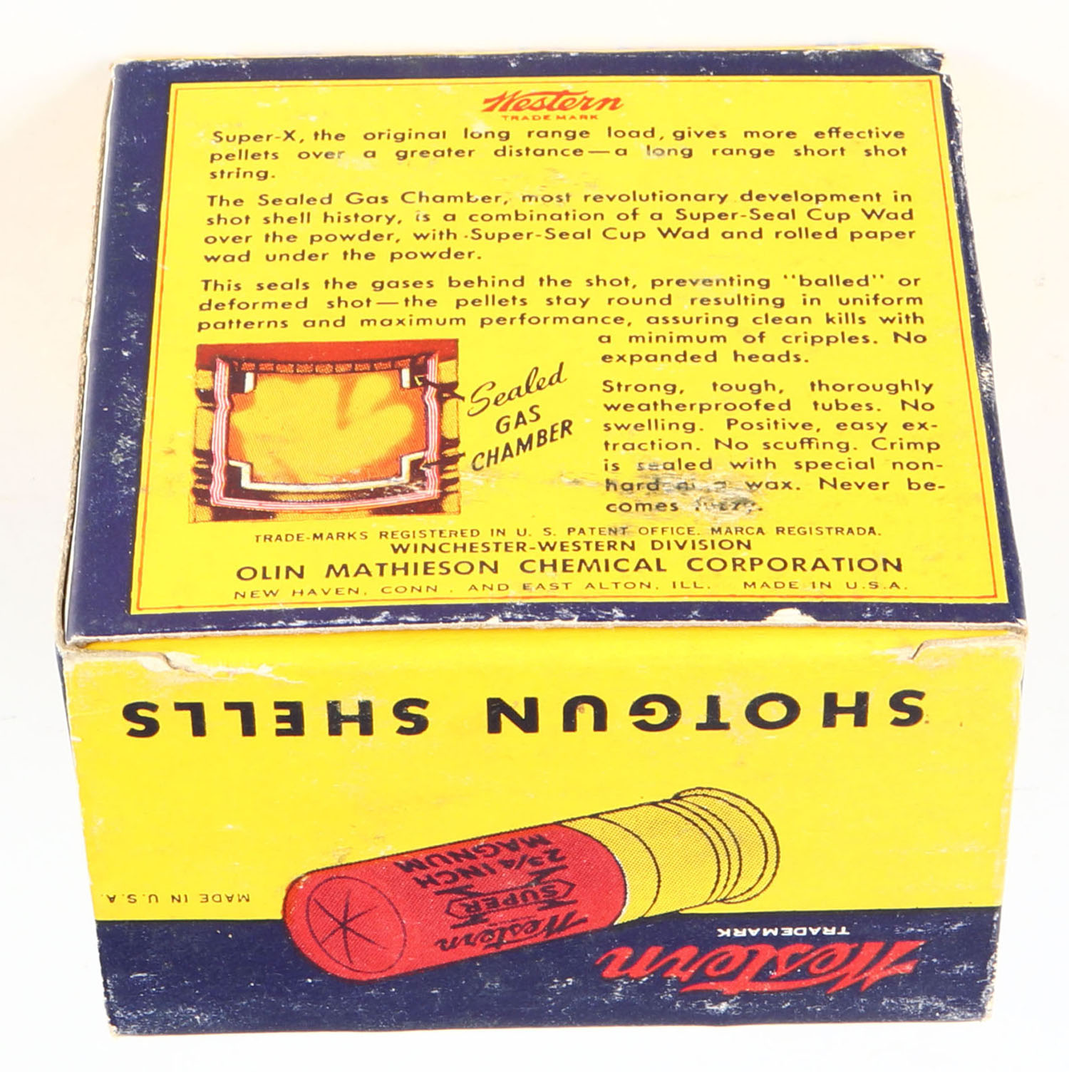 Western, Super X Magnum, with Insert, 12ga., 2 3/4'', 1pc., Full, shot size 4, yellow, blue & red box, box is very solid with light scuffing, paper shells are minty. Grade: Excellent + - Value: 10 to 30