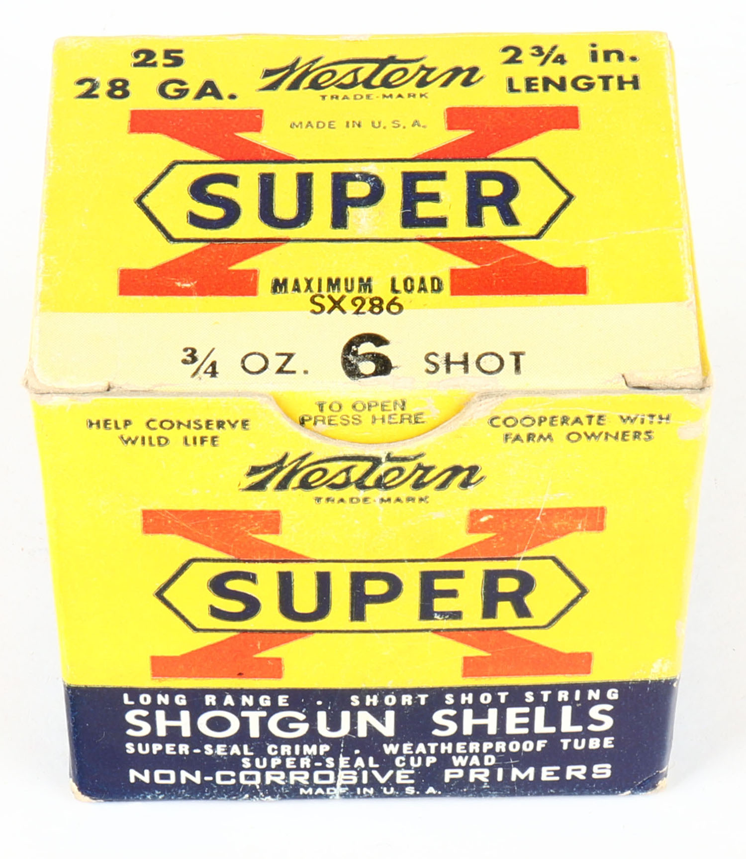 Western, Super X, 28ga., 2 3/4'', 1pc., Partial 20rds., shot size 6, multi-colored box, box is very solid with great colors, paper shells are excellent. Grade: Excellent + - Value: 10 to 30
