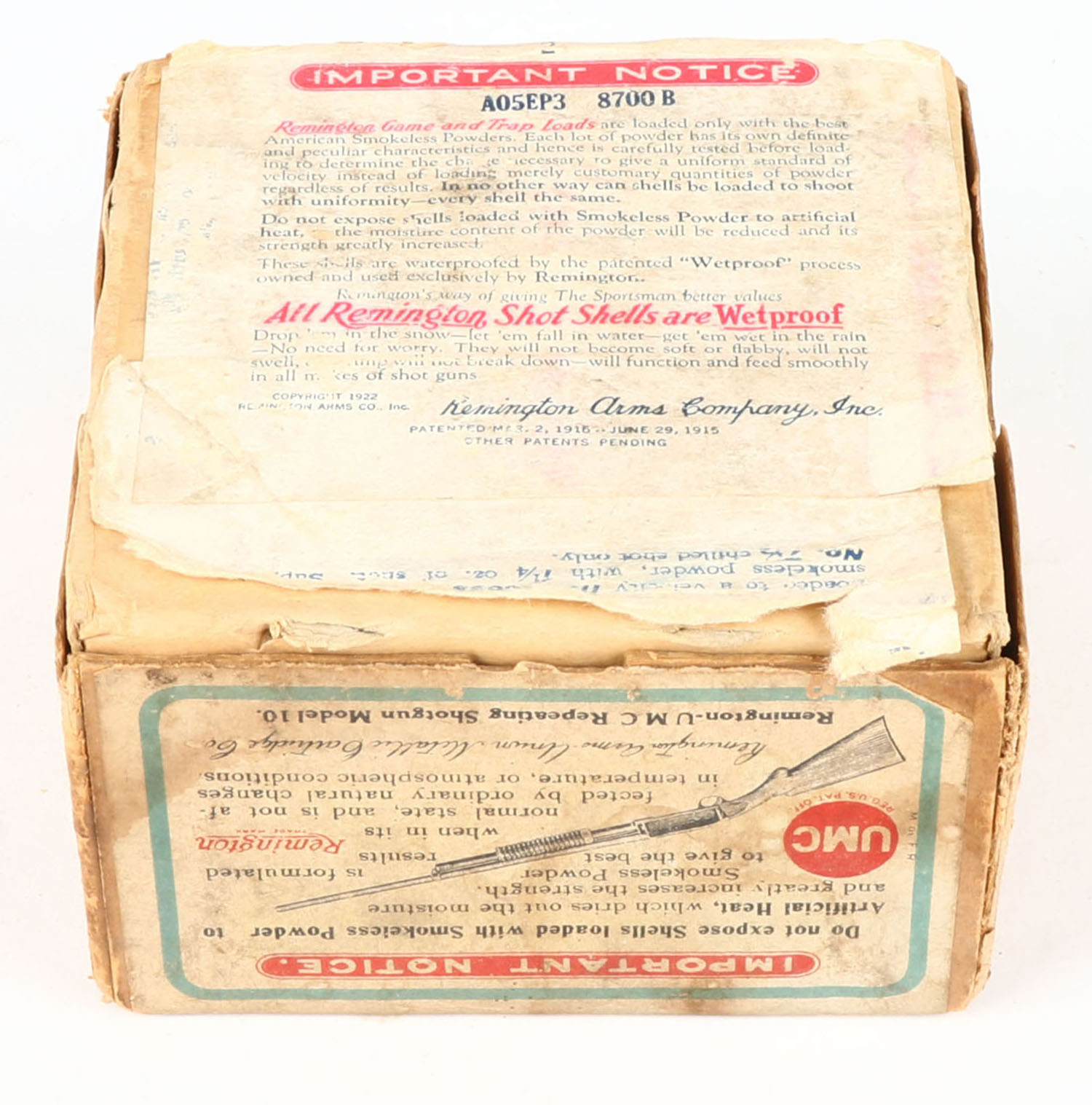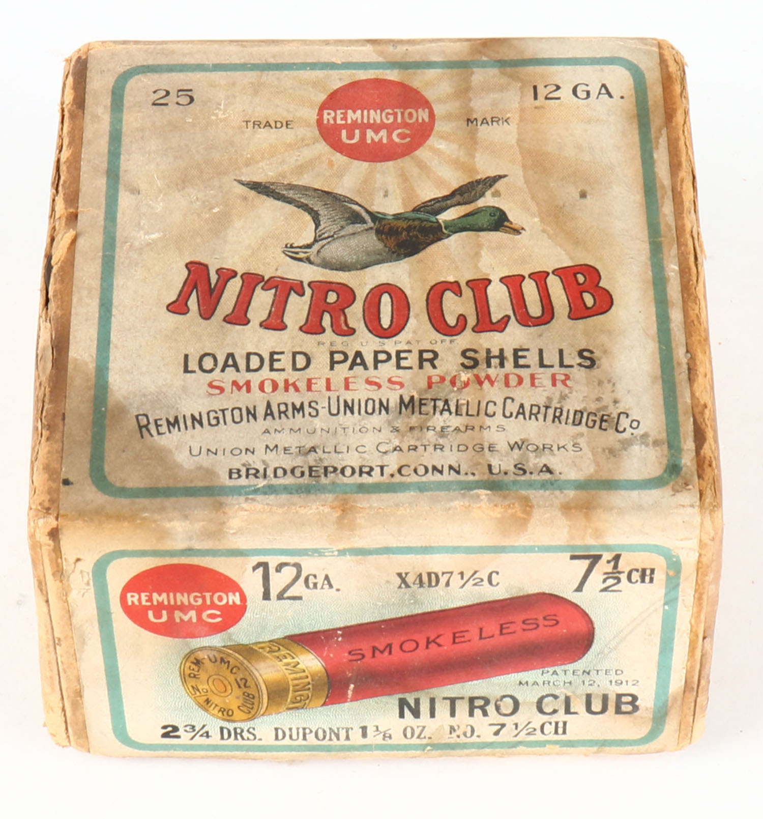 Remington UMC, Nitro Club, 12ga., 2pc., Full, shot size 7 1/2 CH., buff box with sunburst logo & Mallard flying on top, box has a seam split & edge wear with age soiling, paper shells are excellent. Grade: Very Good - Value: 40 to 200