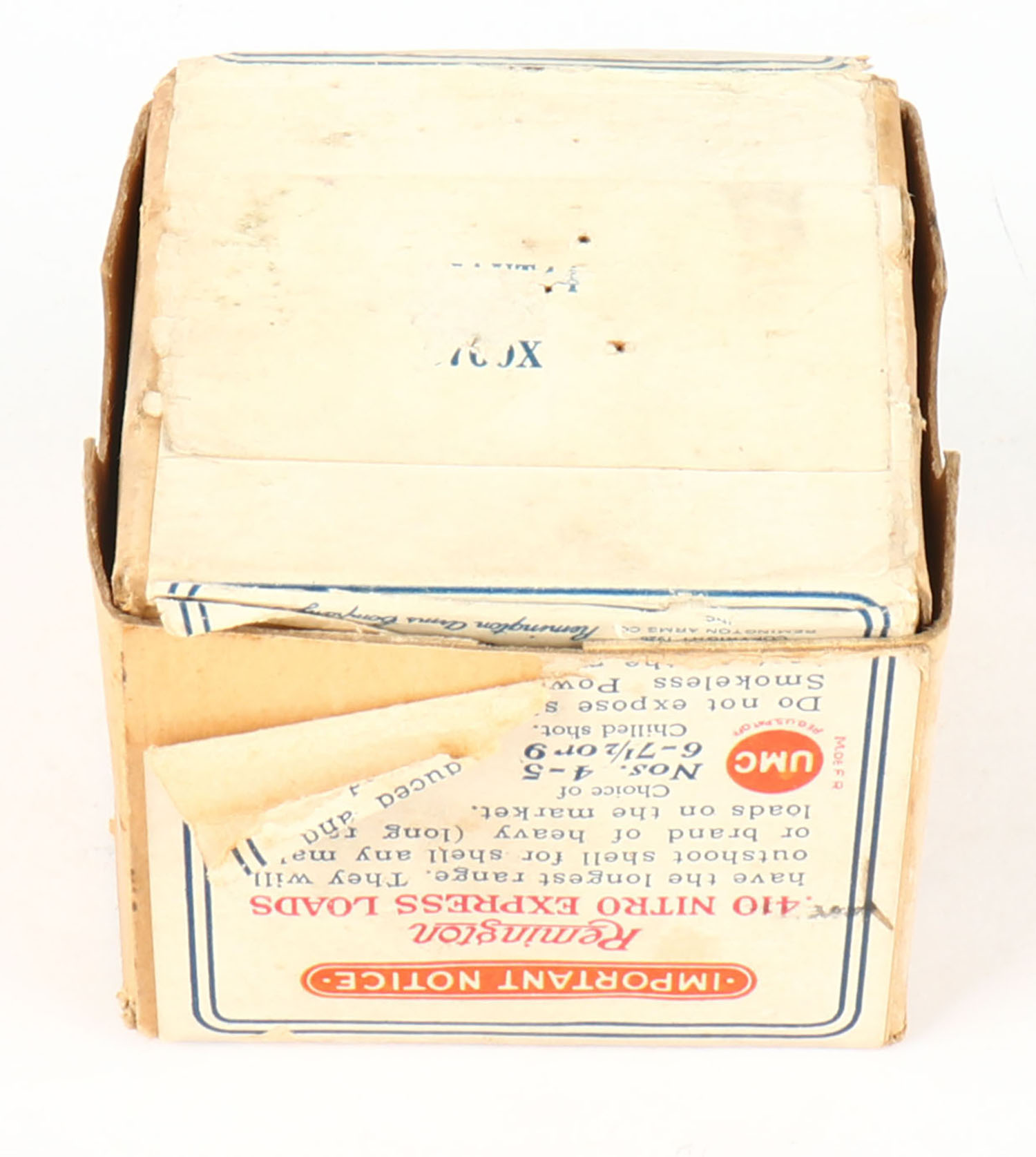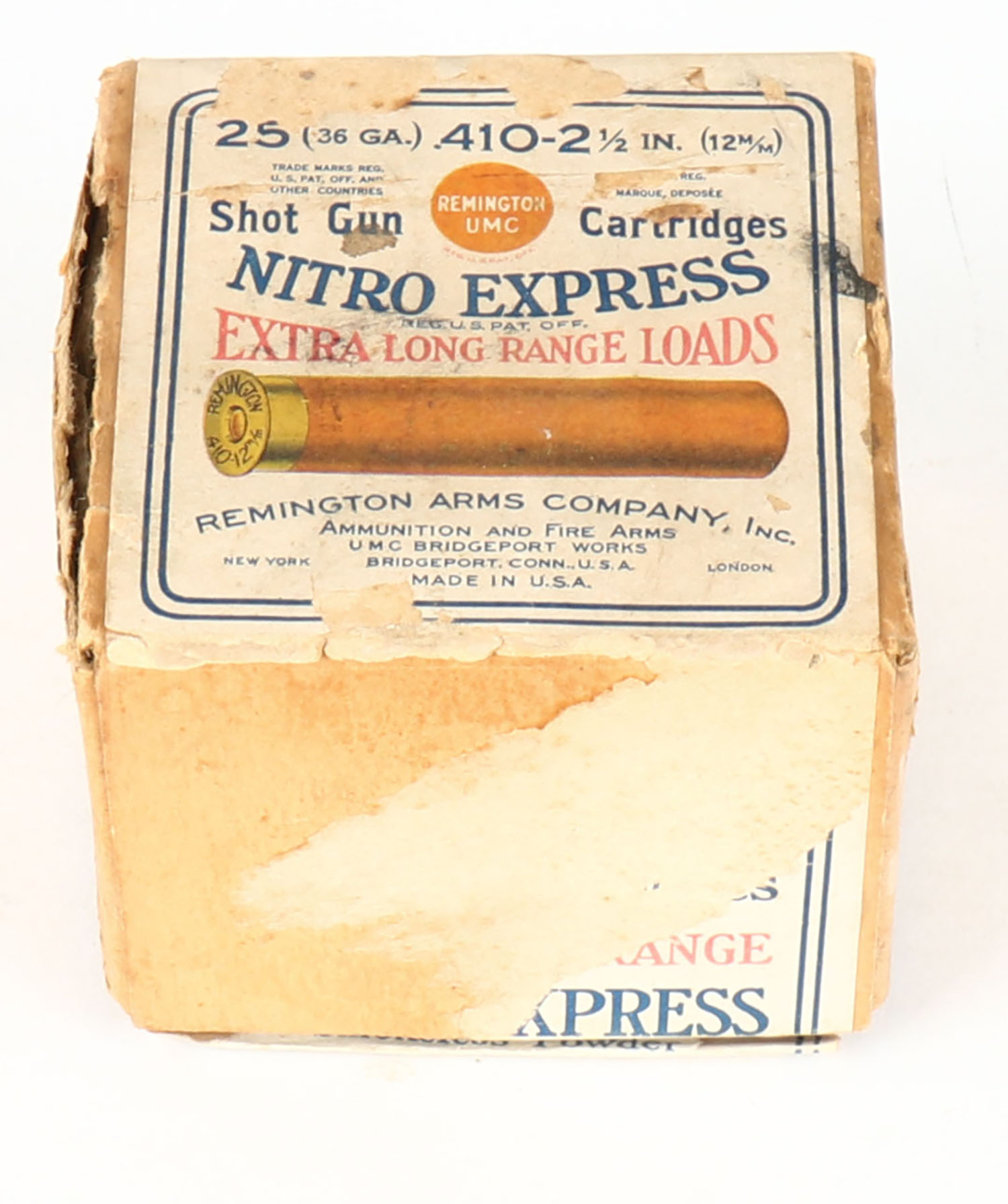 Remington UMC, Nitro Express, 410ga., 2pc., Empty, shot size unknown, buff box with multi-color label, box has age soiling with a seam split & edge wear, label is 70% intact. Grade: Good + - Value: 20 to 100