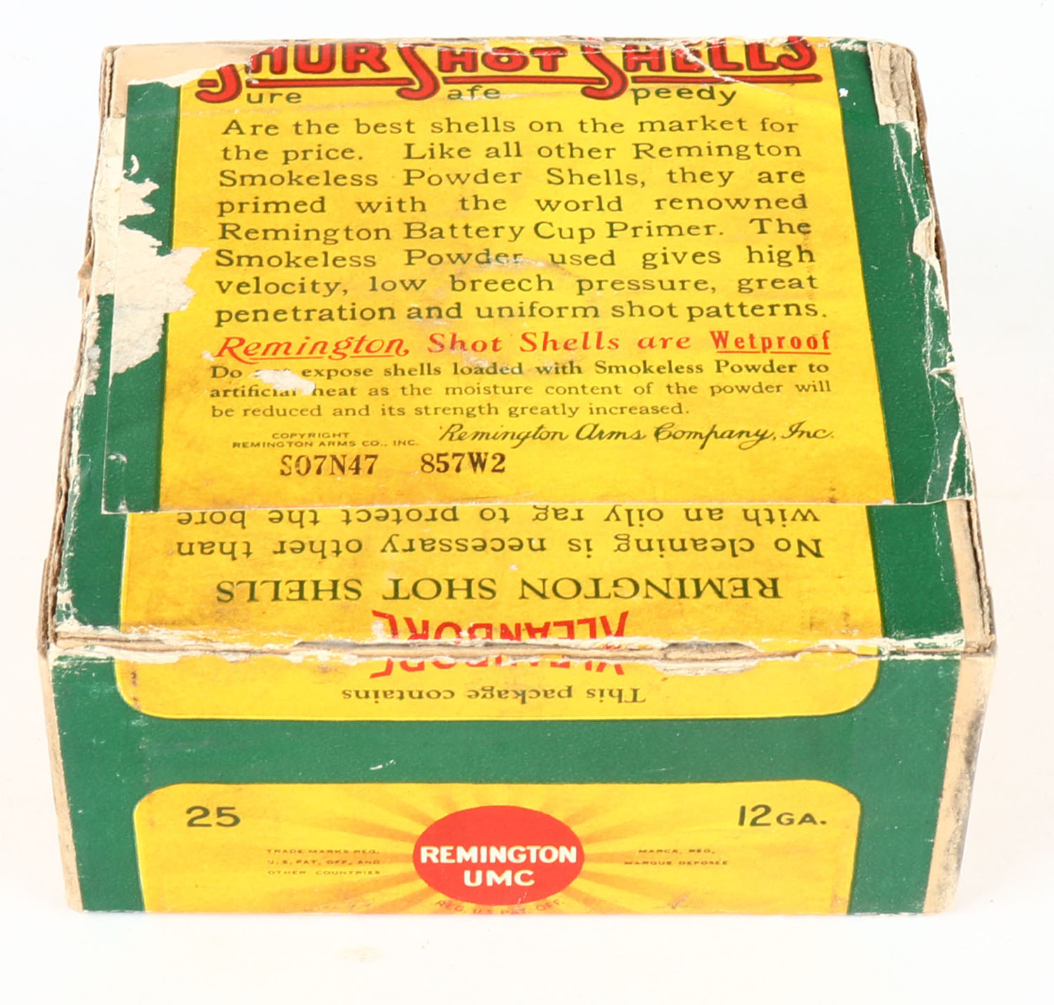 Remington UMC, Shur Shot Shells, 12ga., 2pc., Empty, shot size 5C, green box with green, yellow & red paper label, box has light scuffing with some edge wear. Grade: Very Good ++ - Value: 20 to 100