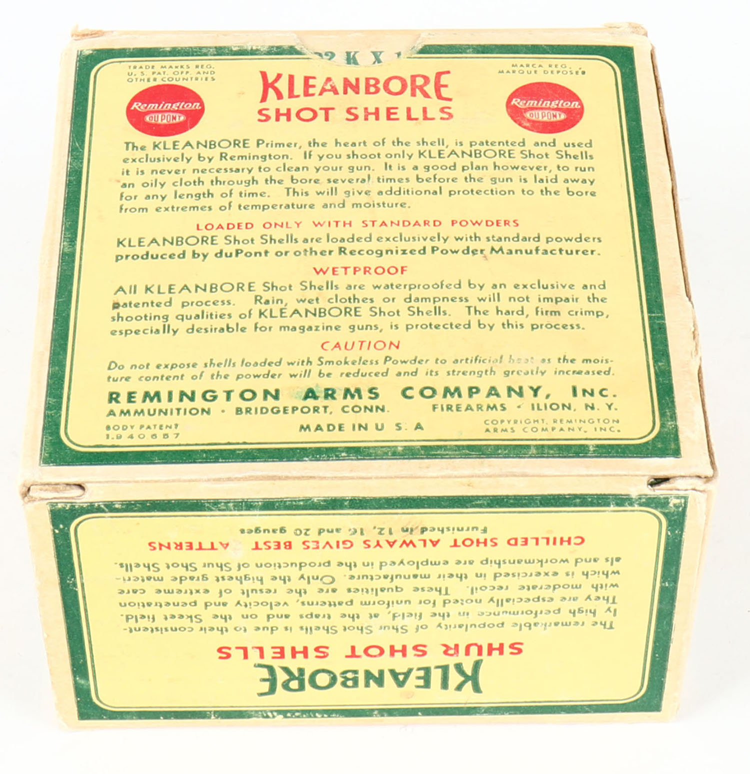 Remington Kleanbore, SHUR SHOT SHELLS, 12ga., 1pc., Full, shot size 7 1/2 Ch., box is yellow, red and green, box has light scuffing with great colors, paper shells are excellent. Grade: Excellent - Value: 10 to 50