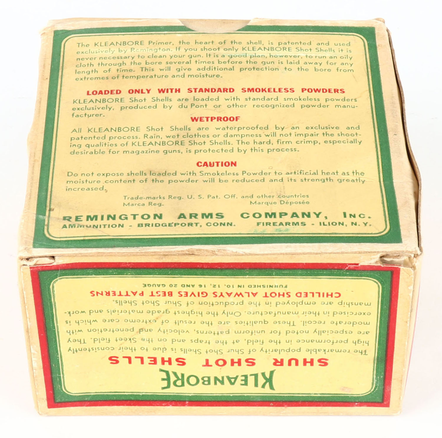 Remington Kleanbore, SHUR SHOT SHELLS, 12ga., 1pc., Full, shot size 4C, box is yellow, red and green, box has light shell protrusion with great colors, paper shells are excellent. Grade: Very Good ++ - Value: 10 to 50
