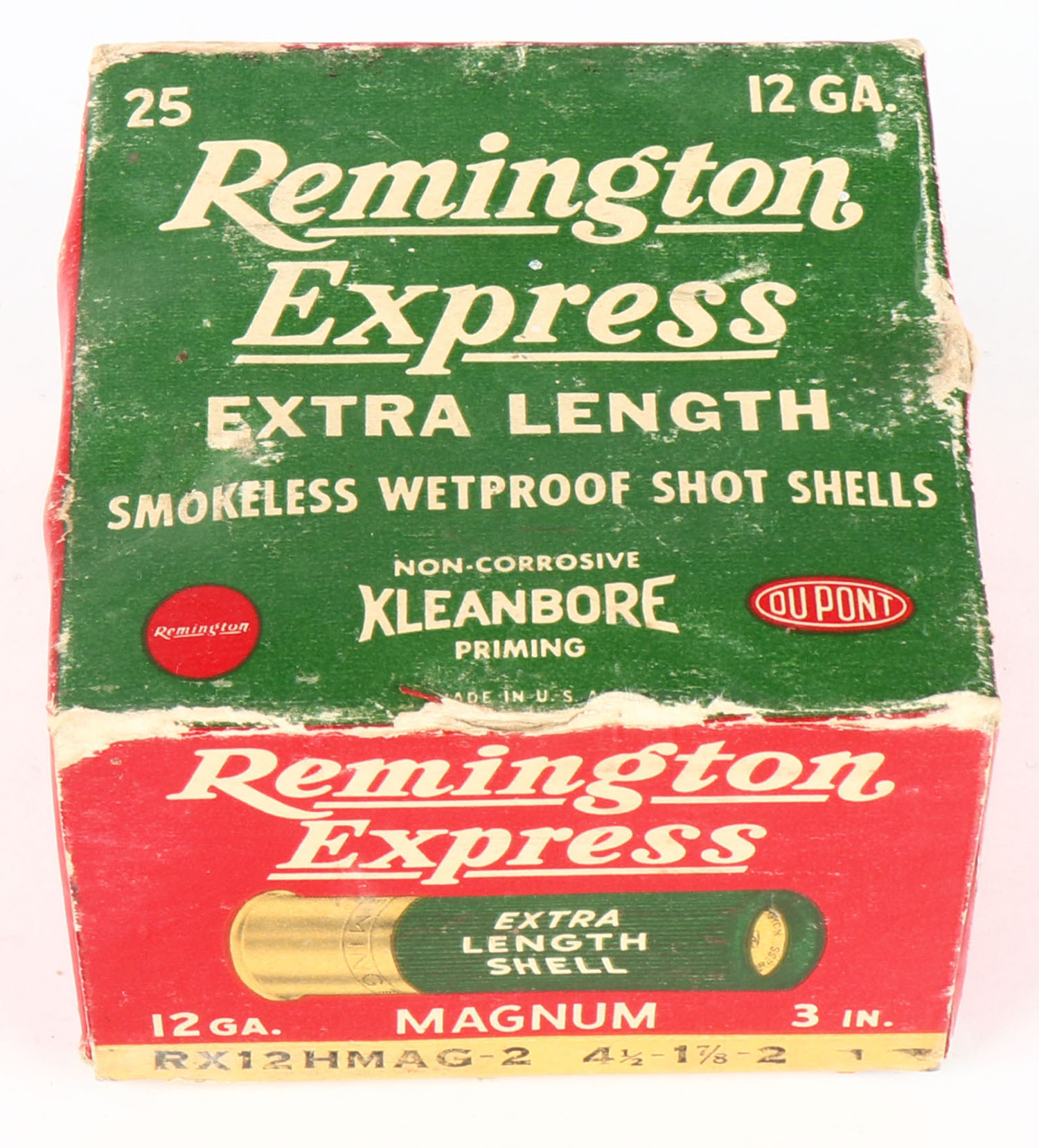 Remington Express, Extra Length, Magnum, 12ga., 1pc., Full, shot size 2, 3'', red, white and green box, box has scuffing with edge wear, paper shells are excellent. Grade: Very Good - Value: 10 to 40