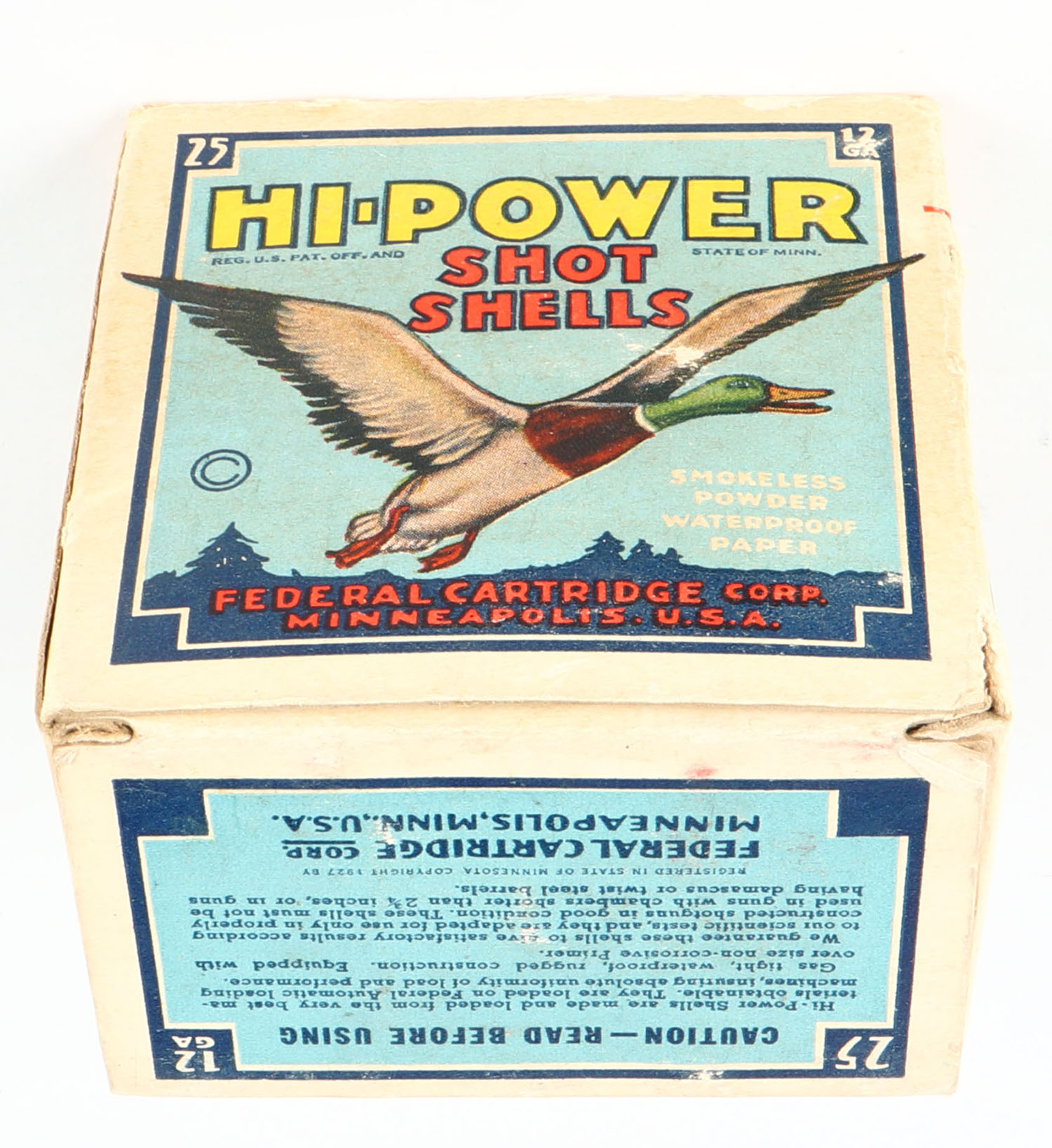 Federal Cart. Co., HI-POWER, 12ga., 1pc., Partial 20rds., shot size 6, Blue border, blue, yellow and red box with flying mallard, box has age soiling with great colors, paper shells excellent. Grade: Very Good - Value: 10 to 40