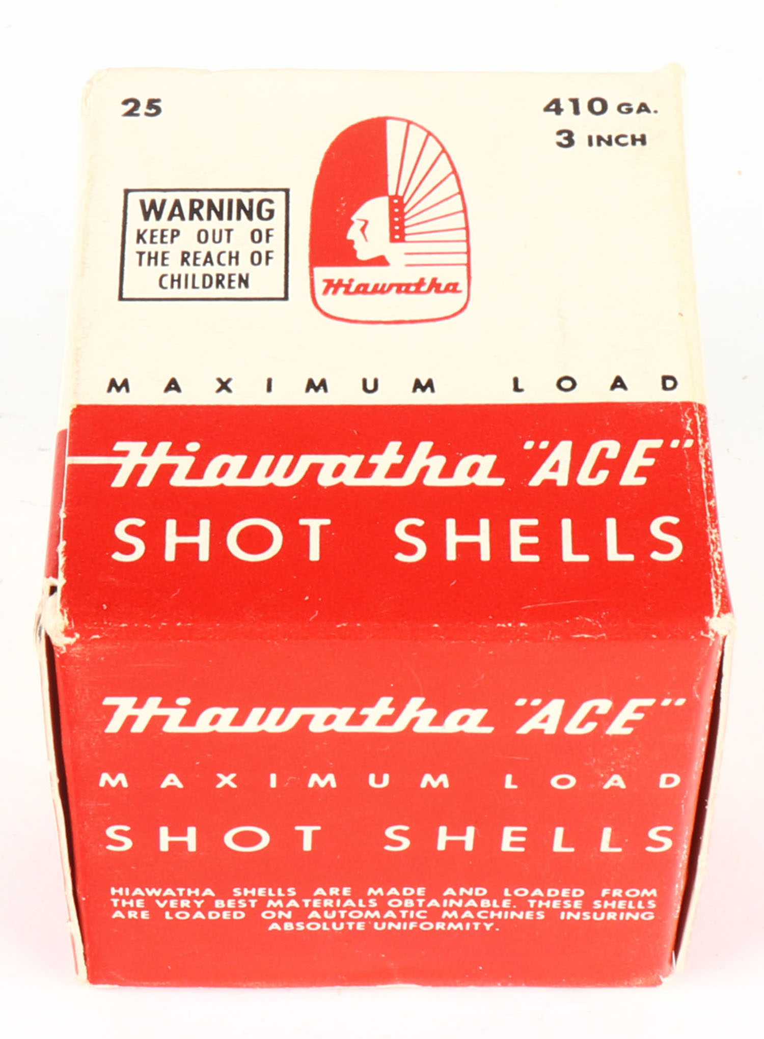 Gambles, Hiawatha ''ACE'', 410ga., 1pc., Full, 3'', shot size 7 1/2, white, red & black box, box is very solid with minor scuffing, plastic shells are excellent. Grade: Excellent - Value: 10 to 30