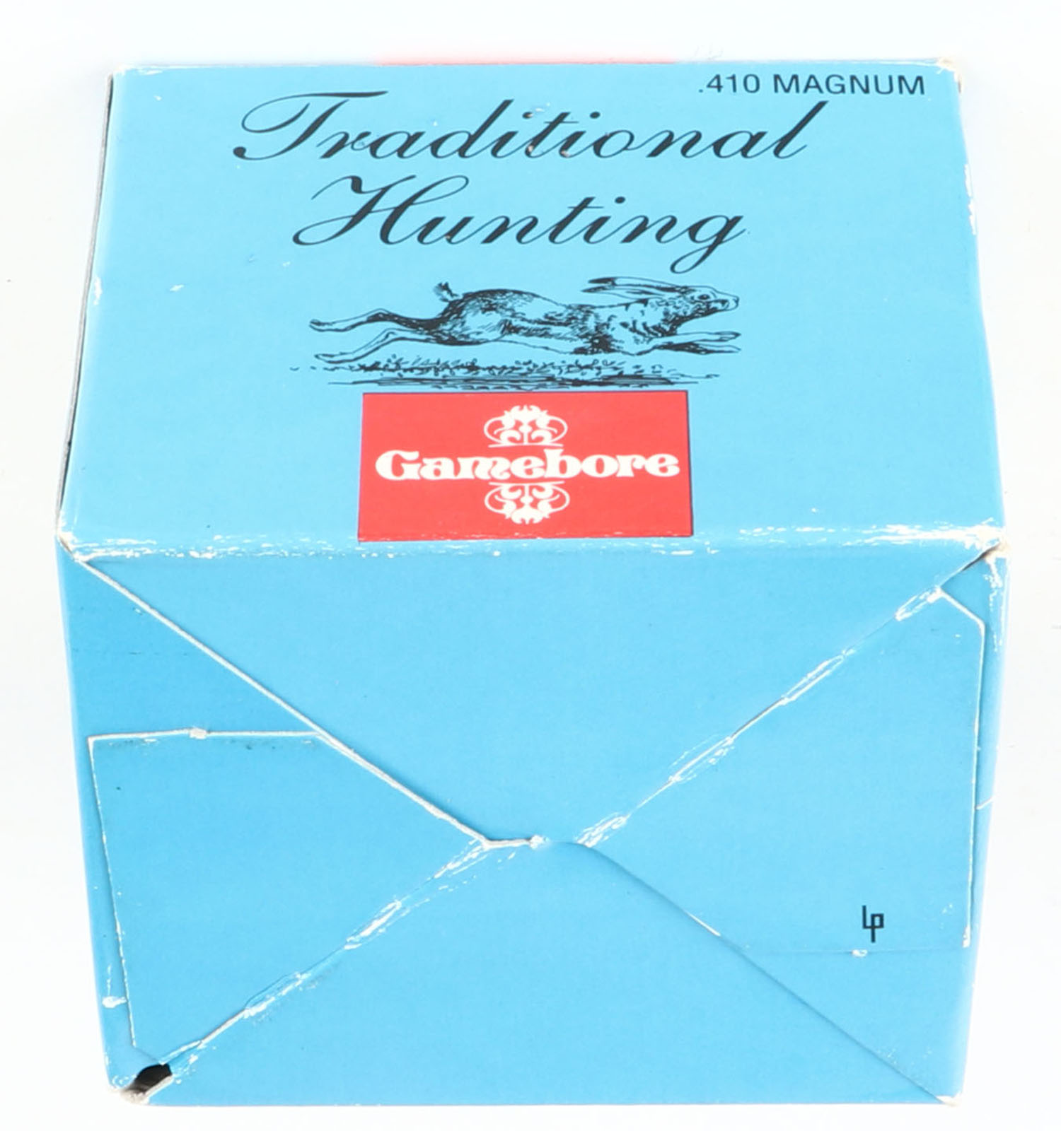 Gamebore, Traditional Hunting, 410ga. Magnum, 1pc., Full, shot size 6, multi-colored box, box is very solid with excellent colors, plastic shells are minty. Grade: MINT - Value: 10 to 60