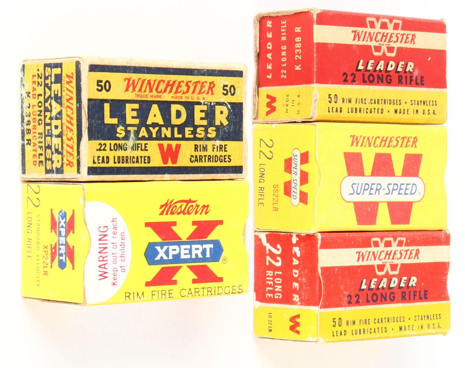 Winchester, lot of (5) boxes, (4) appear full, one of the red Leader boxes is partial 44rds.. Grade: Excellent - Value: 40 to 60