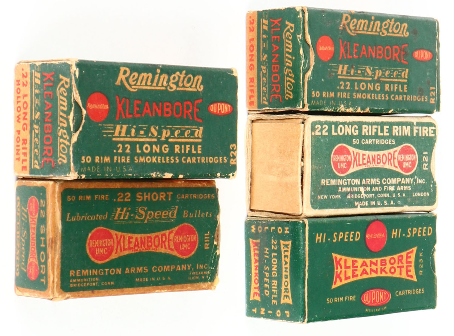 Remington, lot of (5) boxes, (2) appear full, Hi-Speed Kleanbore LR Hollow Point box is partial 35rds., Hi-Speed Kleanbore LR box is full of incorrect ammo, Short box is partial 38rds. Of incorrect ammo. Grade: Very Good - Value: 12 to 18