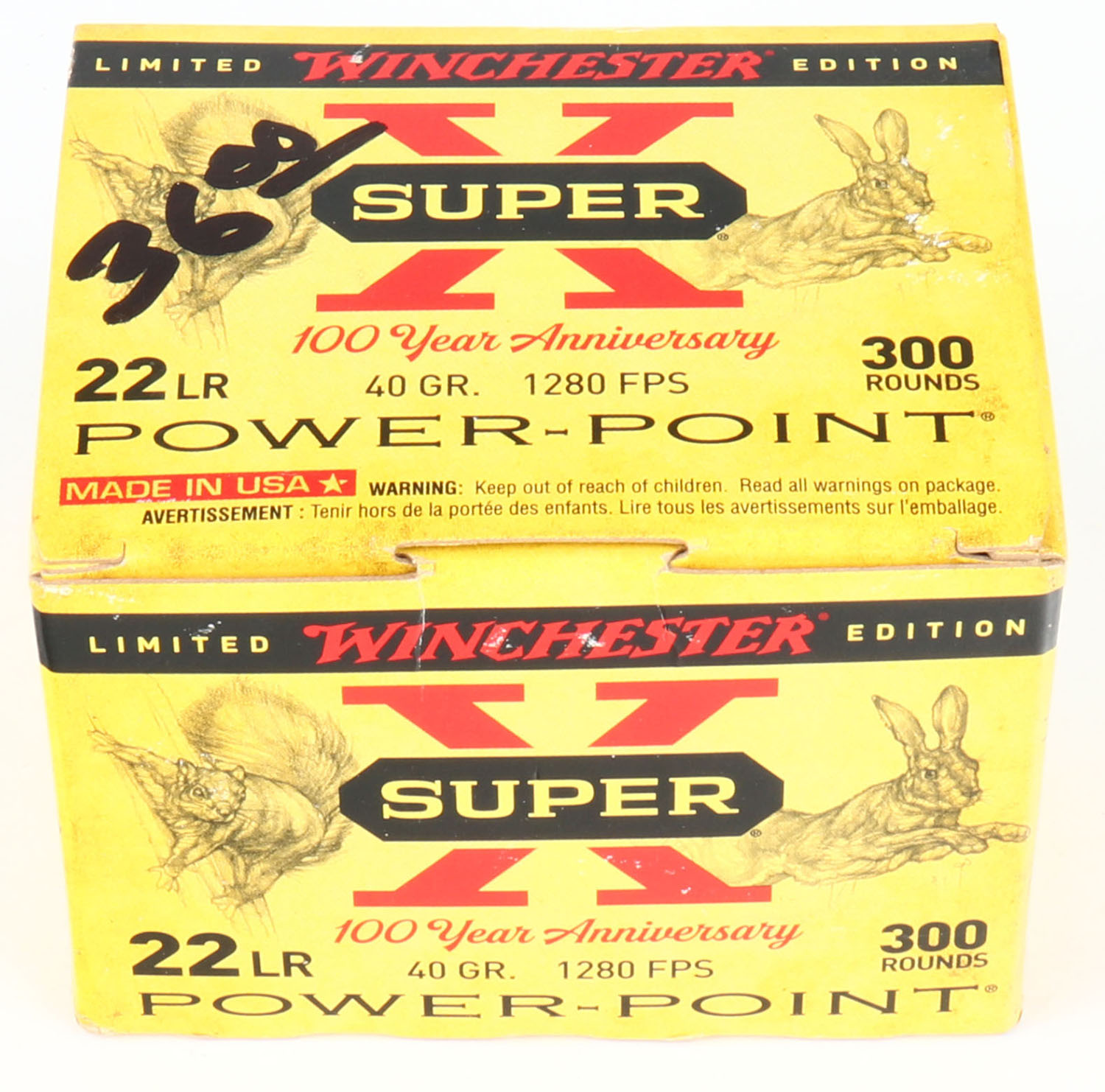 Winchester, Super-X Power-Point, .22 Long Rifle, 40 Grain Bullet, 1280 FPS, Full, 300rds., 1pc. Yellow black & red bulk box, box is solid with minty color, very minor corner wear, top has been written on, edges are crisp, top flap is solid, ammo is minty. Grade: Excellent + - Value: 20 to 30