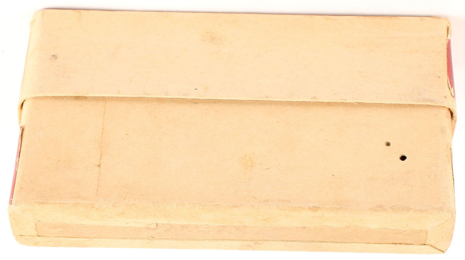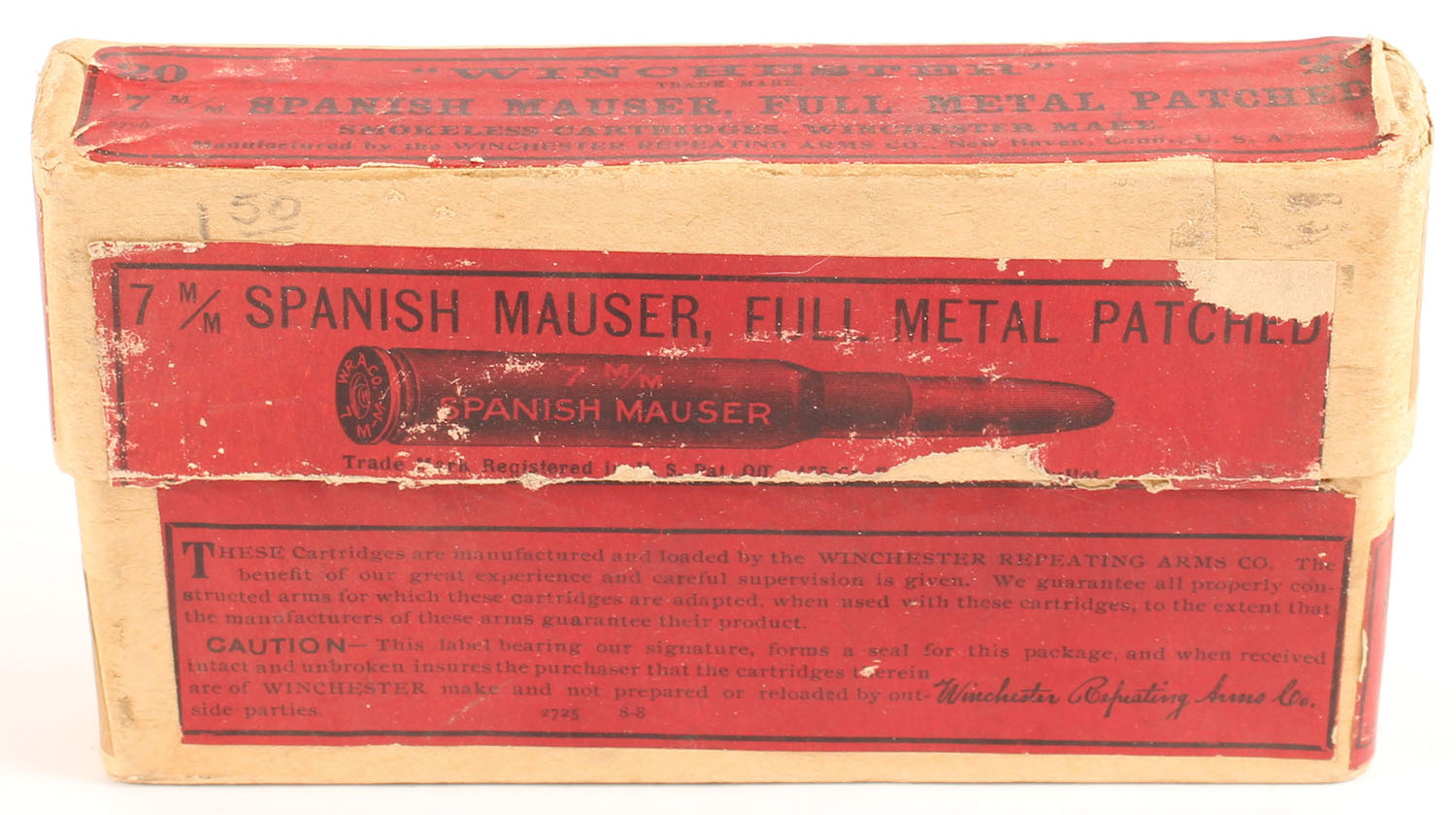 Winchester, Smokeless Cartridges, 7mm Spanish Mauser, Full Metal Patched, Full, 2pc. Buff box with red labels, box is solid with excellent color, some scuffing to front label, minor edge & corner wear, seam split to right edge of lid, front has been written on, labels are intact, ammo is very good. Grade: Very Good ++ - Value: 20 to 30