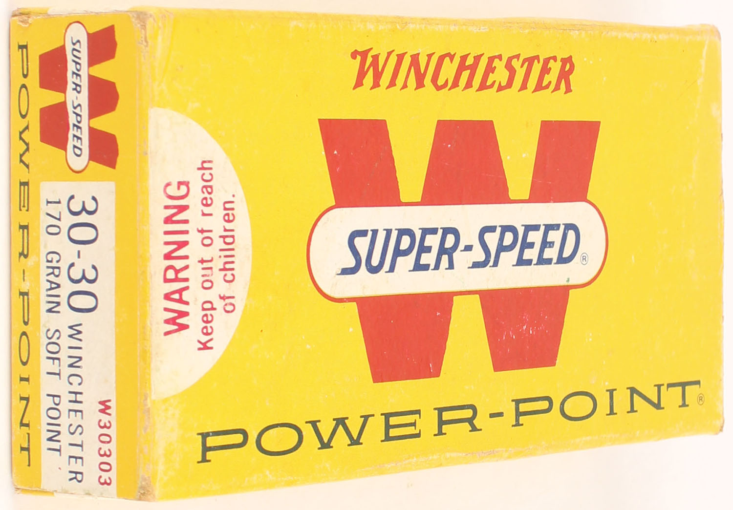 Winchester, Power-Point, .30-30 Winchester, 170 Grain Soft Point Bullet, Full, 1pc. Yellow white & red box, box is solid with excellent color, very minor shelf & corner wear, edges are mostly crisp, end flaps are solid, ammo is excellent. Grade: Excellent + - Value: 24 to 36