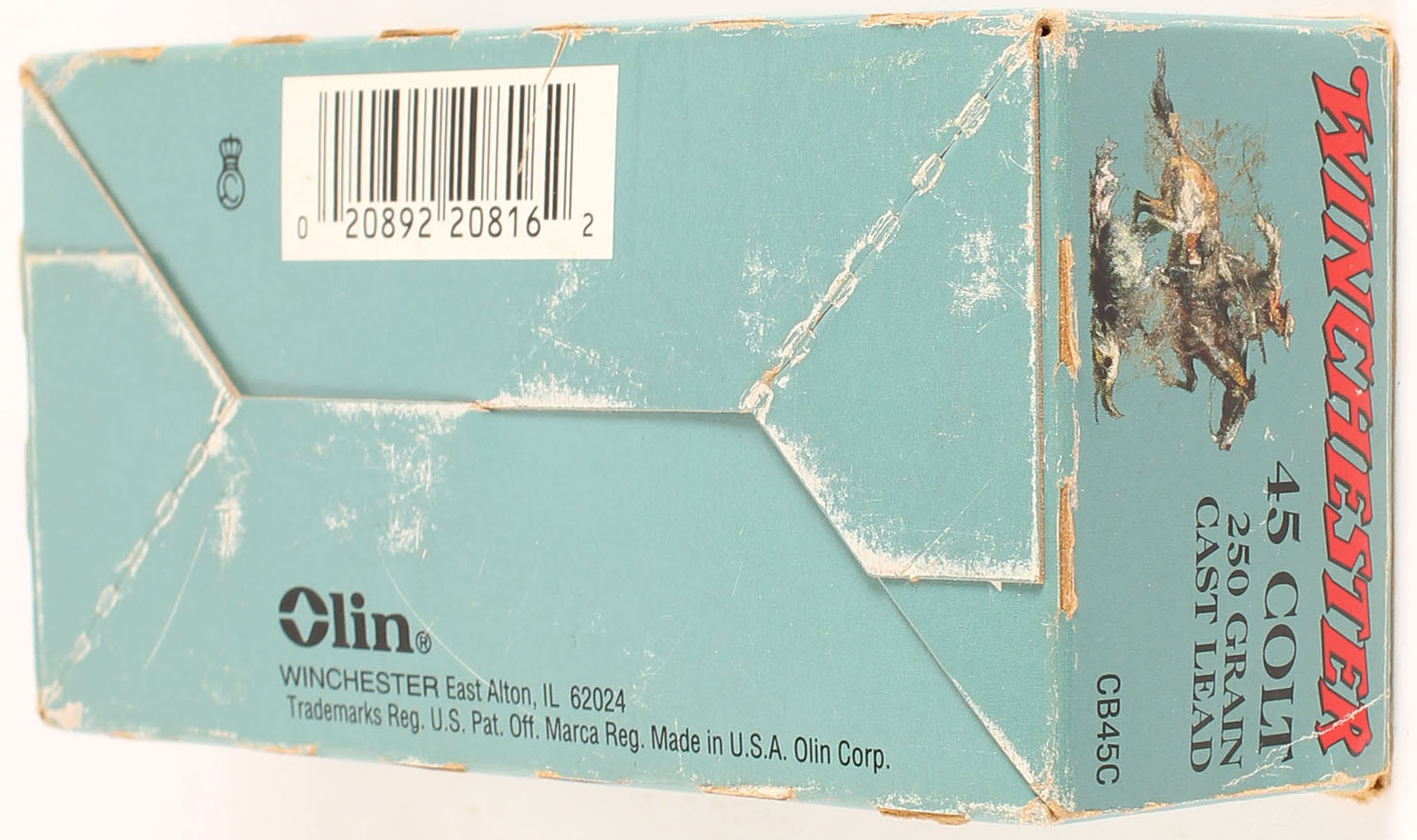 Winchester, Cowboy Action Loads, .45 Colt, 250 Grain Cast Lead, Full, 1pc blue & red box, box is solid with excellent to minty color, minor shelf & corner wear, very minor edge wear, top flap is solid, ammo is minty. Grade: Excellent + - Value: 60 to 80