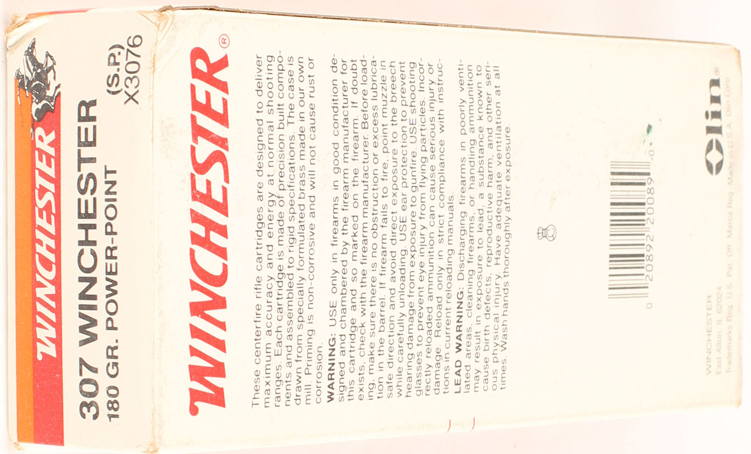 Winchester, Super-X, .307 Winchester, 180 Grain Power-Point, Full, 1pc. White red & orange box, box is solid with excellent color, some corner wear, edges are mostly crisp, sticker on top, end flaps are solid, ammo is excellent to minty. Grade: Excellent + - Value: 40 to 60