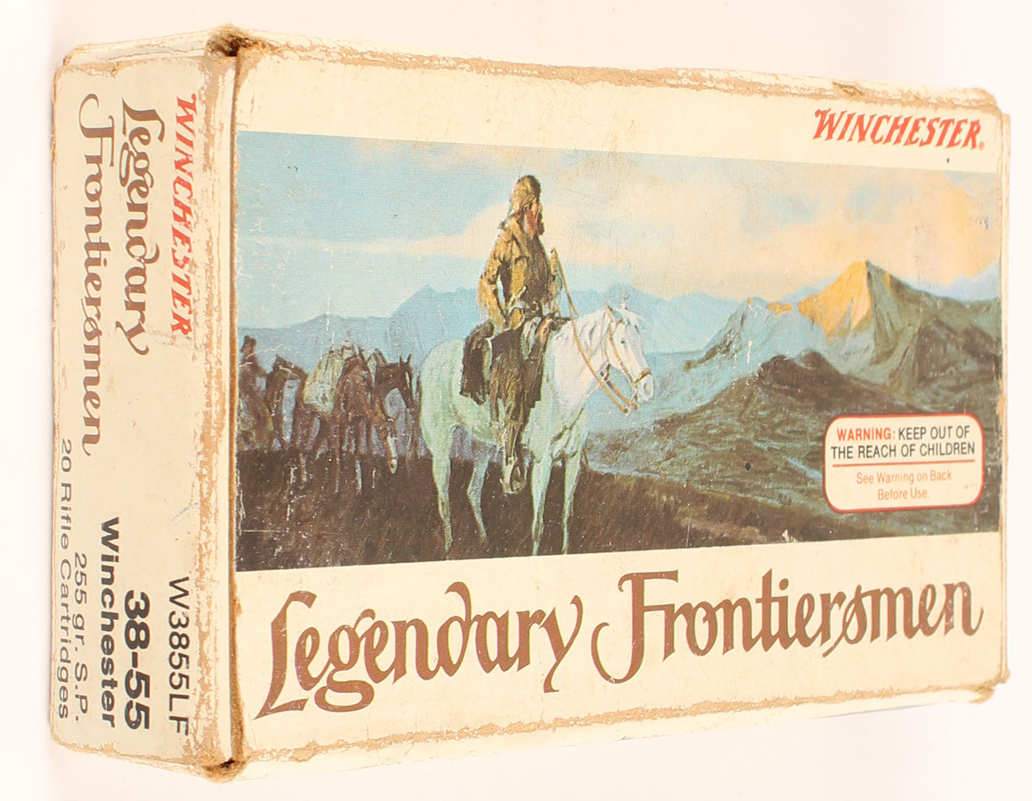Winchester, Legendary Frontiersmen, .38-55 Winchester, 255 Grain Soft Point, Partial 11rds. correct, 1pc. Multi-colored box, box is solid with very good color, some age soiling, edge & corner wear, end flaps are solid, ammo is excellent. Grade: Very Good - Value: 30 to 45