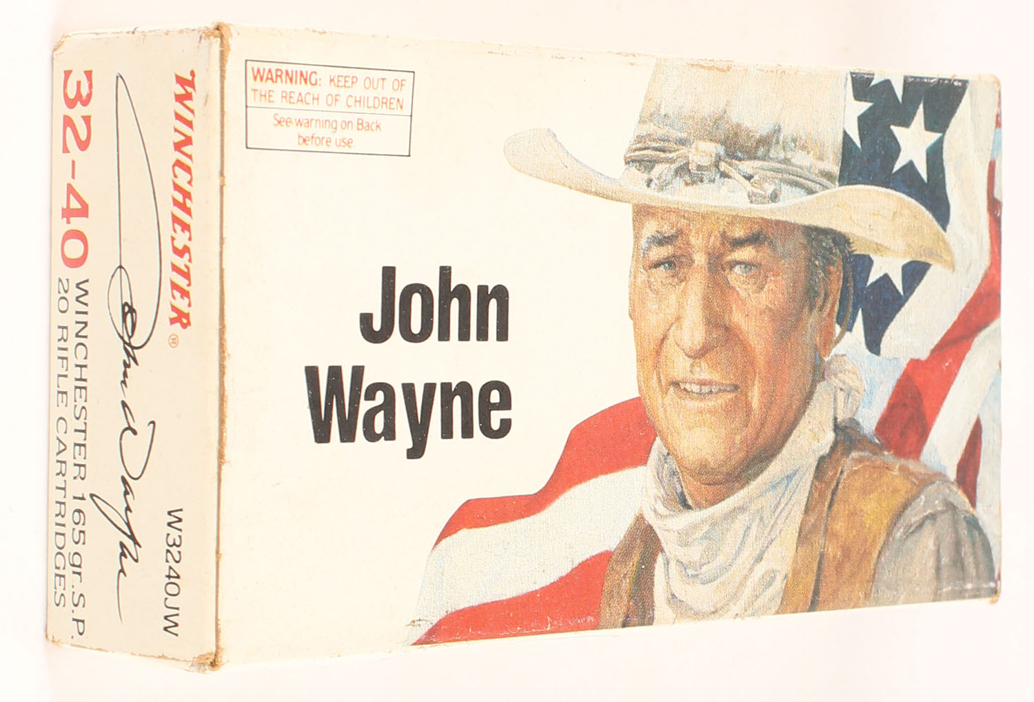 Winchester, John Wayne, .32-40 Winchester, 165 Grain Soft Point, Full, 1pc. White box featuring John Wayne, box is solid with excellent color, very minor edge & corner wear, crease on front side, end flaps are solid, ammo is minty. Grade: Excellent - Value: 80 to 120