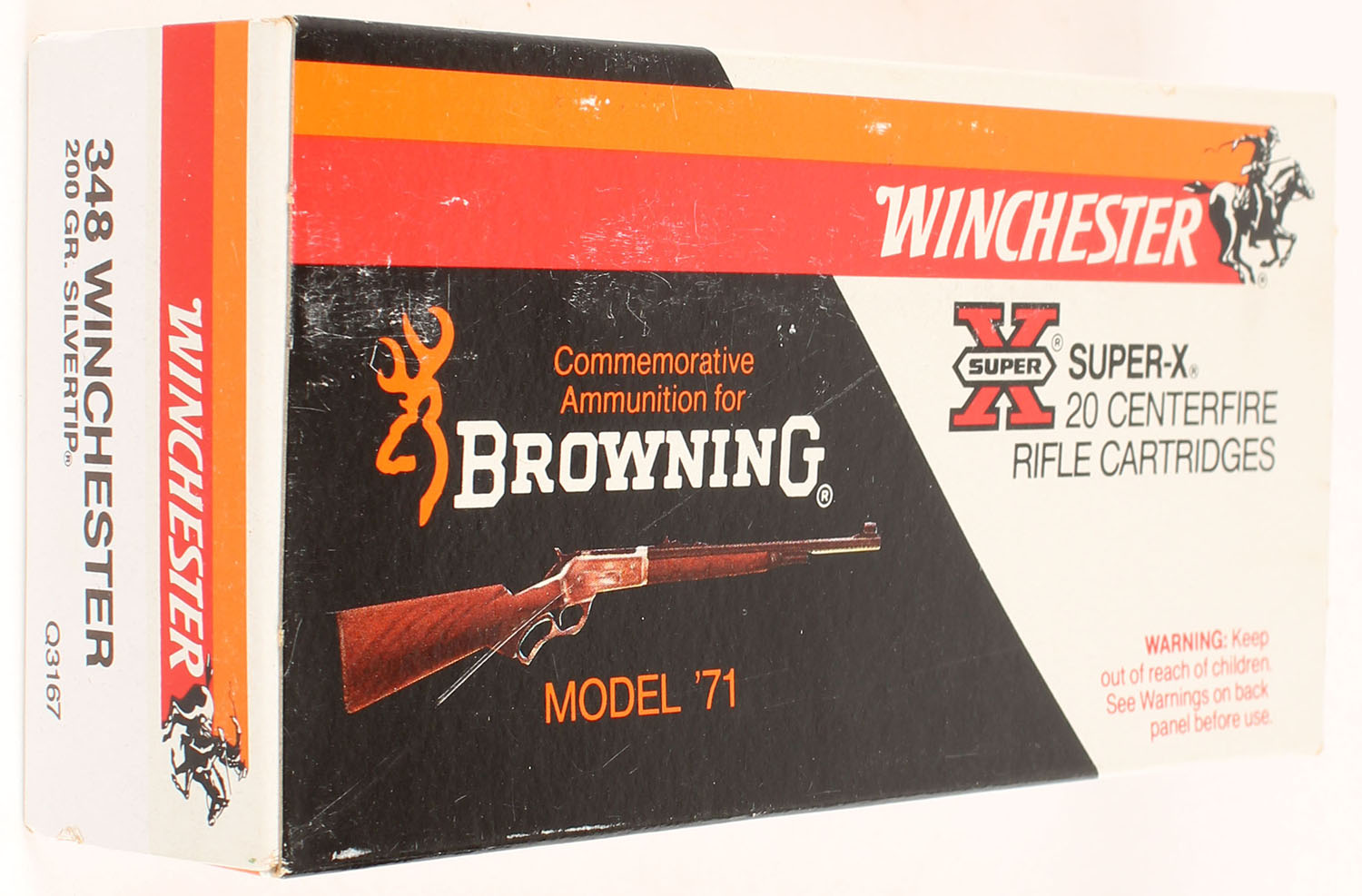 Winchester, Browning Model '71 Commemorative Box, .348 Winchester, 200 Grain Silvertip, Full, 1pc. Multi-colored box featuring a model 71, box is near mint with minty color, only very minor shelf wear, corners are sharp, edges are crisp, end flaps are solid, ammo is excellent. Grade: Excellent ++ - Value: 80 to 120