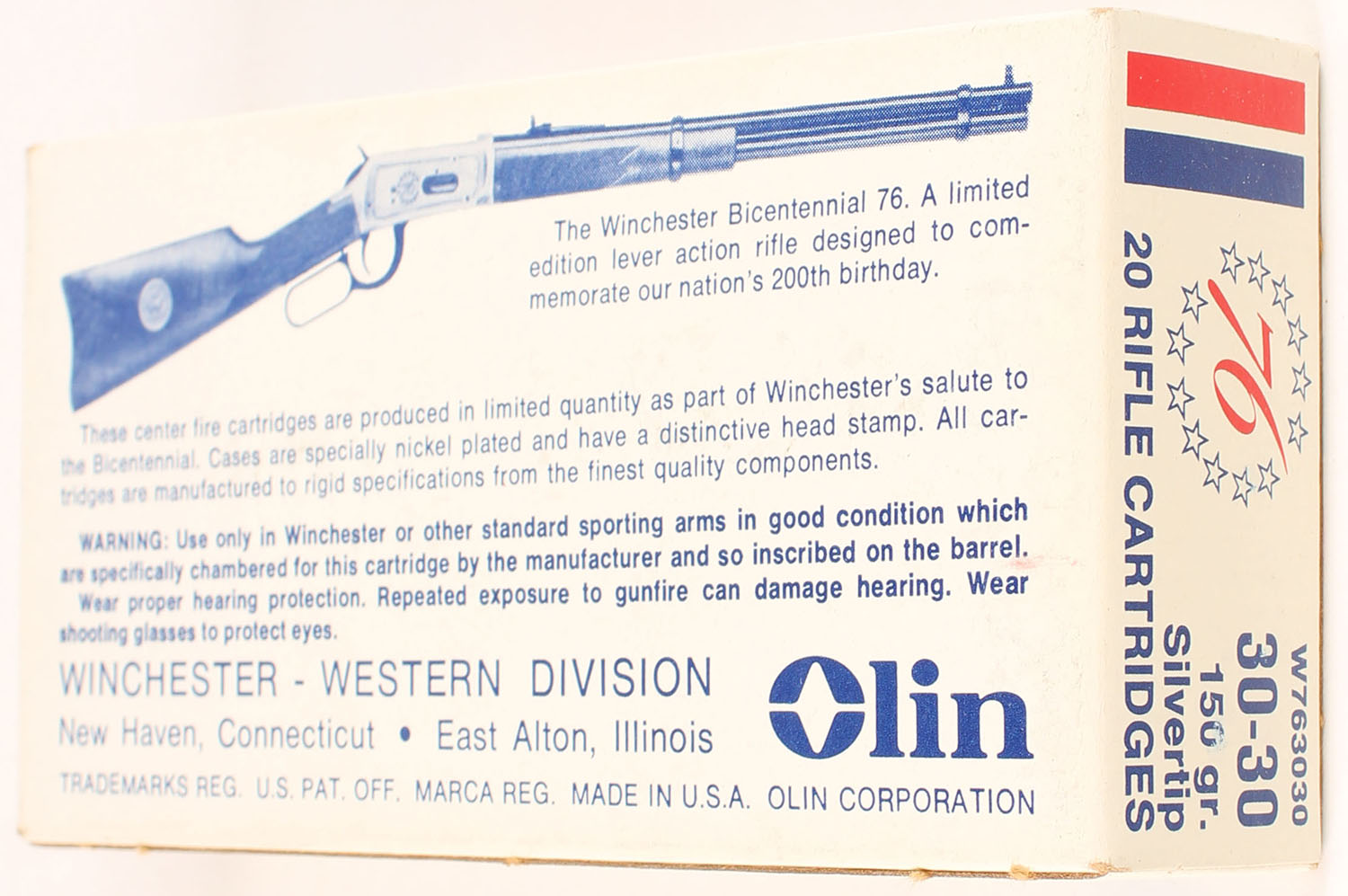 Winchester, Bicentennial, .30-30 Winchester, 150 Gr. Silvertip, Full, 1pc. White blue & red box, box is solid with excellent color, very minor corner wear, edges are crisp, end flaps are solid, ammo is minty. Grade: Excellent ++ - Value: 40 to 60