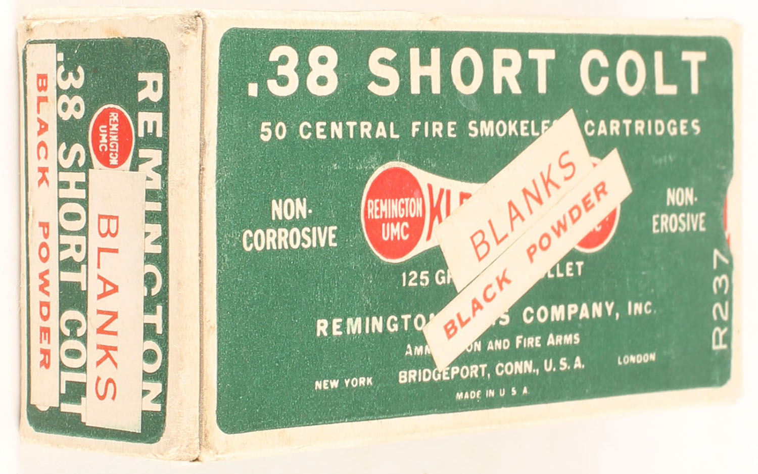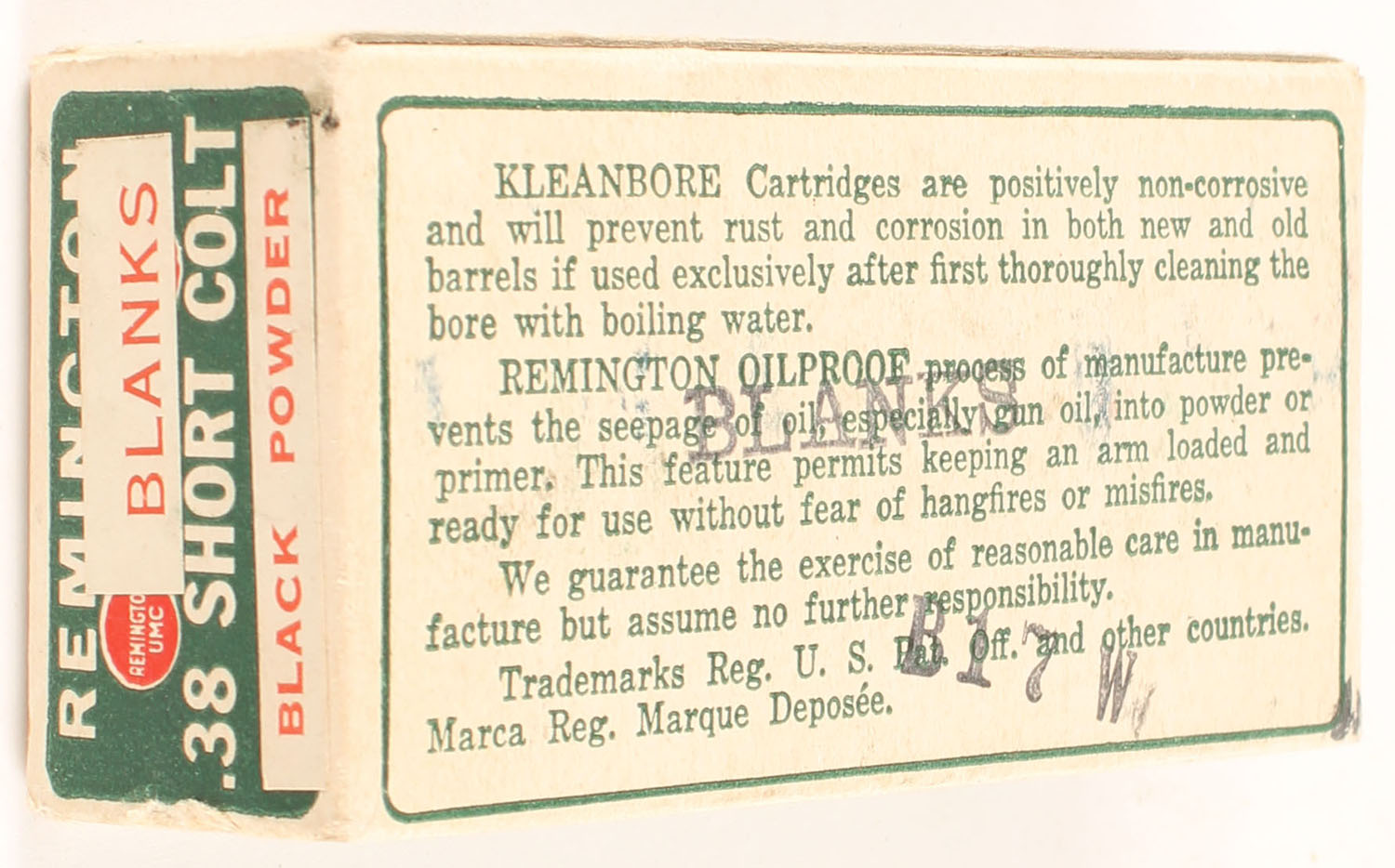 Remington, Kleanbore, .38 Short Colt Blanks, Black Powder, Full, 1pc. Green buff & red dog bone box with white ''Blanks'' & ''Black Powder'' over-labels, box is solid with excellent to minty color, minor corner wear, edges are crisp, end flaps are solid, ammo is good to very good. Grade: Excellent + - Value: 40 to 60
