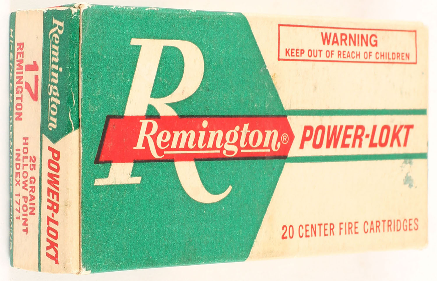 Remington, Power-Lokt, .17 Remington, 25 Grain Hollow Point, Full with 1rd. being fired, 1pc. White green & red box, box has light age soiling with good color, has partially torn right end flap, ammo is excellent. Grade: Very Good ++ - Value: 50 to 75