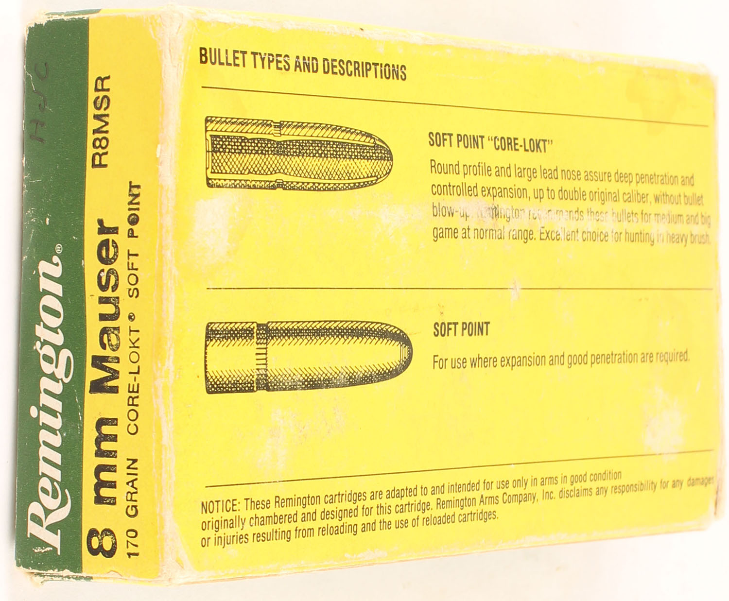 Remington, High Velocity, 8 mm Mauser, 170 Grain Core-Lokt Soft Point, Partial 18rds., 1pc., Green & yellow box, box has edge & corner wear with some age soiling, ammo is very good. Grade: Good ++ - Value: 16 to 24