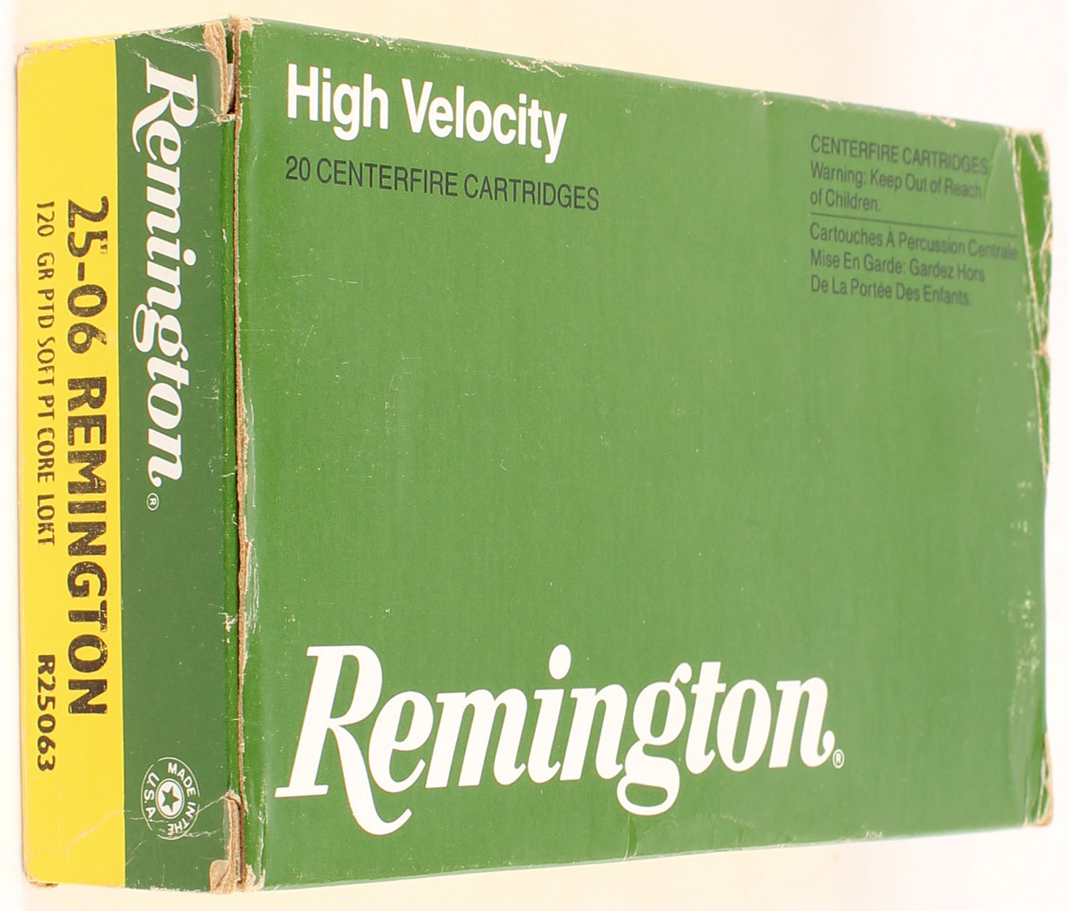 Remington, .25-06 Remington, High Velocity, 120 Gr Core-Lokt Soft PT, 1pc, Partial 14rds, Green & yellow box with black/white print, box has corner wear, end flaps are solid, ammo is excellent. Grade: Very Good ++ - Value: 24 to 36