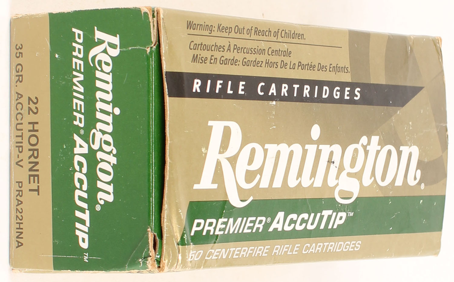 Remington, Premier AccuTip, 22 Hornet, 35 Grain AccuTip-V, Full, 1pc, Gold, green, white & black box, box has light scuffing & edge wear, end flaps are solid, ammo is excellent. Grade: Very Good - Value: 60 to 90