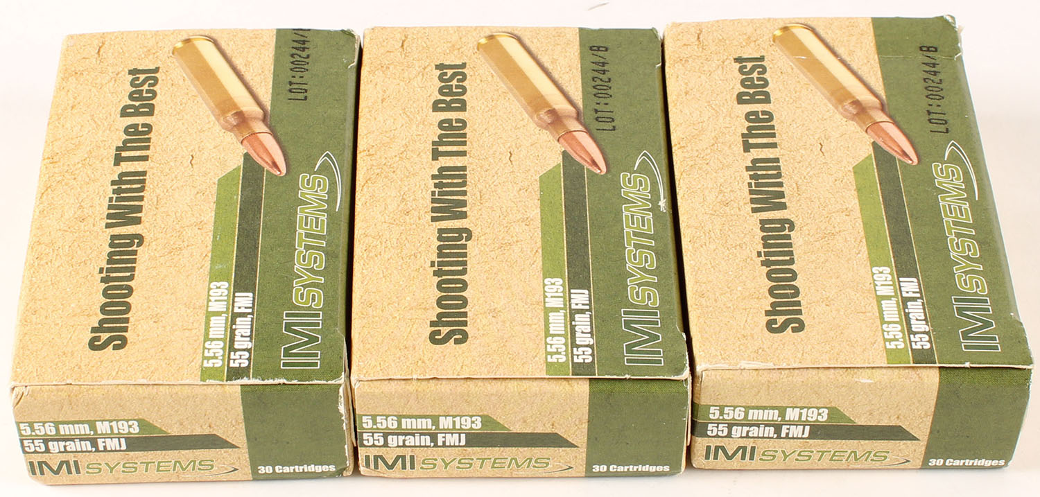 IMI Systems, Lot of (3), 5.56mm, M193, 55 Grain FMJ, Full, 1pc, multi-colored boxes, boxes are very solid, ammo is minty. Grade: Excellent ++ - Value: 26 to 40