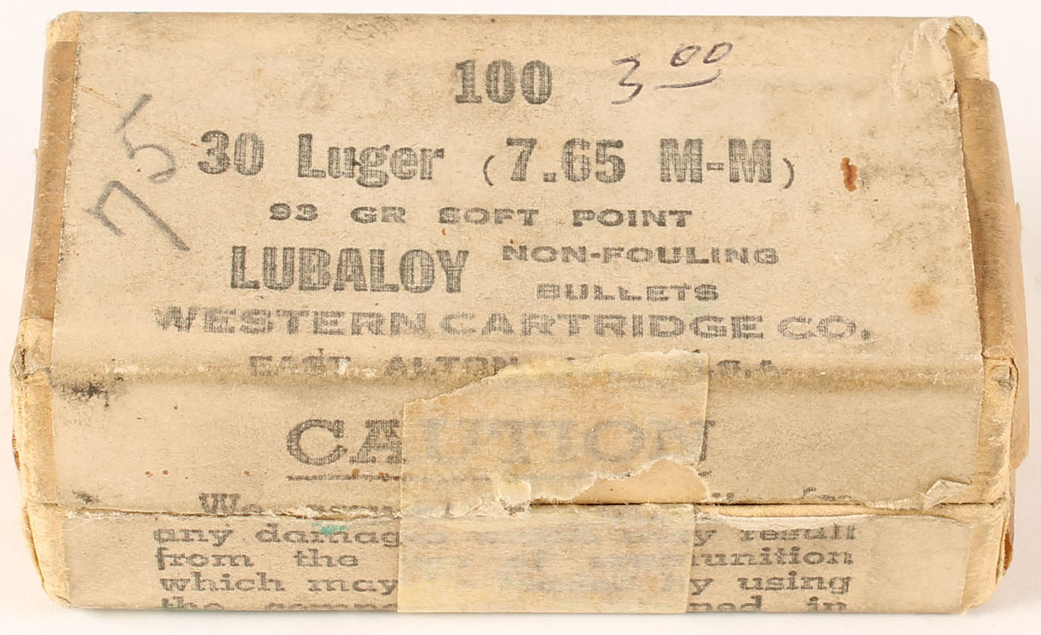 Western, .30 Luger, 93 Grain Soft Point Lubaloy, Appears 2/3 Full, 2pc, Buff box with buff & black label, box has some age soiling, edges are mostly crisp, label is intact, bullets are very good. Grade: Good ++ - Value: 24 to 36