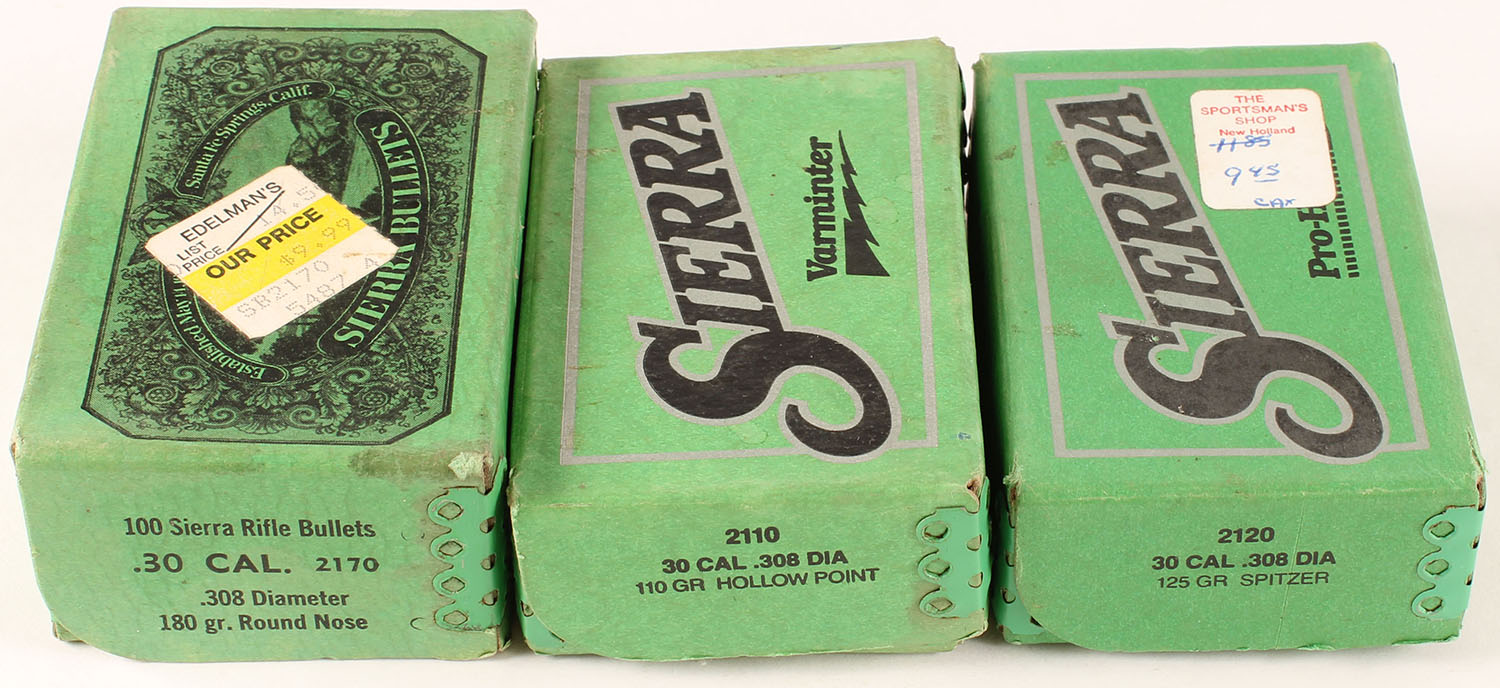 Sierra, Lot of (3), .30 Cal., 110, 125 & 180 Grain, .308'' Dia., Appear Partial, 1pc, Green boxes, boxes are solid, bullets are excellent. Grade: Very Good - Value: 20 to 30