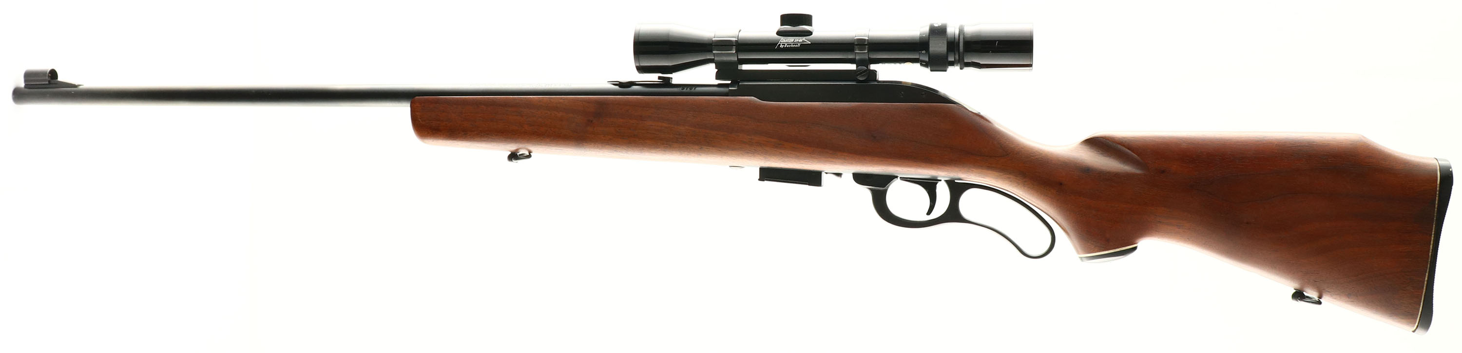 Marlin, Model 62 Levermatic Carbine, CAL: 256 WIN MAG, CAL: 1963-69, SN: 6707, Lever Action Rifle, 24'' Round barrel. The capped, flat pistol grip Monte Carlo style wood stock is excellent. It displays very few light surface scratches or handling marks to its excellent original finish. The metal blue finish rates 95% overall. The Micro Grooved bore is excellent. The rifle comes fitted with a Banner by Bushnell 3x-8x scope, while the barrel has a Marbles folding leaf rear & a ramp hooded blade front sight. Buttstock carries the original Marlin marked checkered black plastic buttplate. Sling swivels. Missing the Marlin trademark bullseye from the belly of the stock. Original detachable mag. An original & excellent overall example. FFL or C&R Req. - Value: 600 to 1200