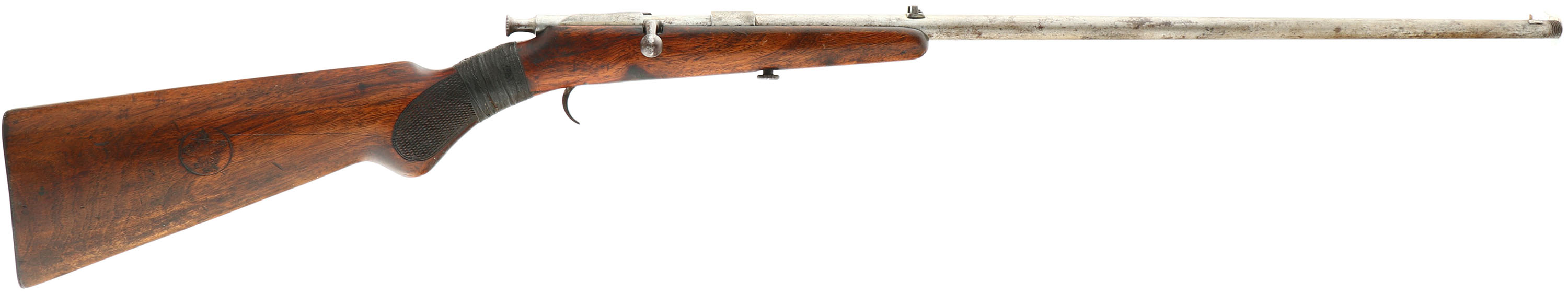 Gustav Genschow & Co., Original Geco Carabiner, Model 1919, .22 L.R Cal. (54 MM), MFG: 1920's, SN: 805, Bolt Action Rifle, 23'' round barrel, with treaded muzzle. These German made rifles were often refered to in Europe as ''Garden Guns''. The checkered, cheeked & round pistol grip wood stock is fair & solid, despite a break in the stock which has necessitated tape at the wrist & a large glued crack repair on the left side of receiver running into the checkering on left side of wrist. The stock has small contusions, scrapes & scratches to the original finish. There is a large trademark oak leaf/tree cartouche on the right side of stock, with the word ''GECO'' & ''1919''. The top of the receiver has the same leaf/tree & ''GECO'' trademark. The metal blue finish has fully worn gun metal gray. The barrel is fitted with a fixed rear sight & a gunsmith made post in dovetail front sight. Bore is fair, with roughness, pitting & scarring amongst worn rifling. Smooth metal buttplate. Missing the triggerguard. Appears to fuction fine, but could use some work to restore properly. FFL or C&R Req. - Value: 50 to 100