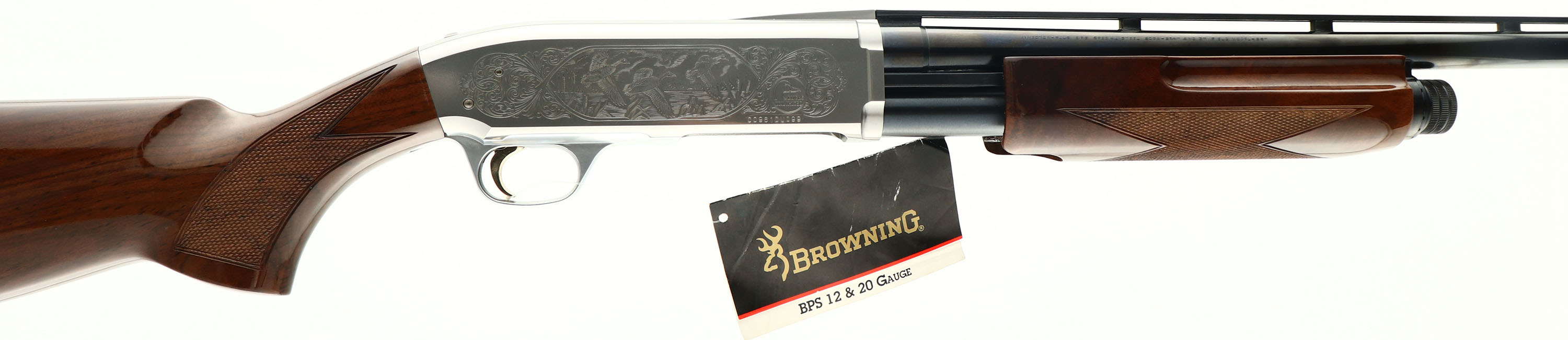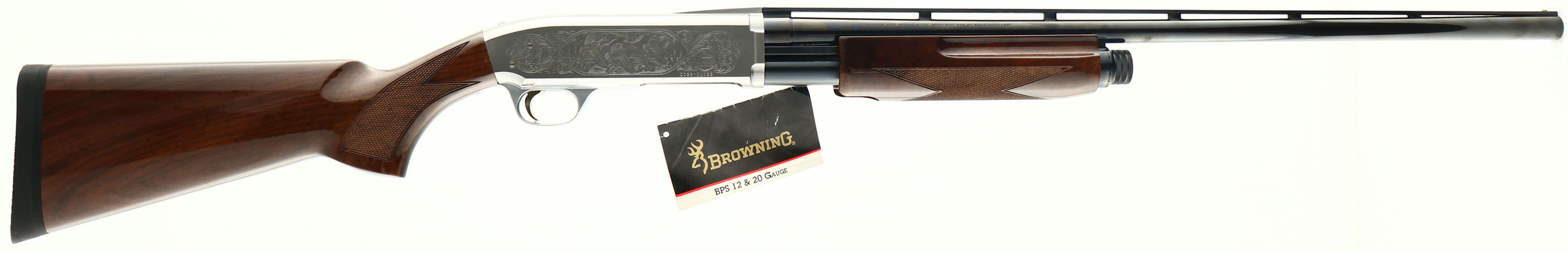 CASED Browning, Model BPS Engraved DU shotgun, 20 Ga., MFG. Modern, SN: 00961DU099, Pump Action Shotgun, made in Japan, 26'' Matted Vent Rib barrel, take down, Interchangeable invertor choke tube system with all three chokes, 2 3/4'' - 3'' shells, High grade walnut glossy checkered stocks are near Mint, with flat knob pistol grip, factory solid black buttpad, Metal blue is 100%, with distinctive silver engraved receiver that pictures Mallards setting in on both sides, Bore is mint, NIB, bright & shiny, Bottom eject (great for left or right handed shooters), Thumb safety, 14 1/2'' LOP over pad, Comes with correct factory case with lock, wrench & paperwork, Here is your chance to buy a near mint BPS that has been out of production for 25 yrs. FFL Req. - Value: 800 to 1600