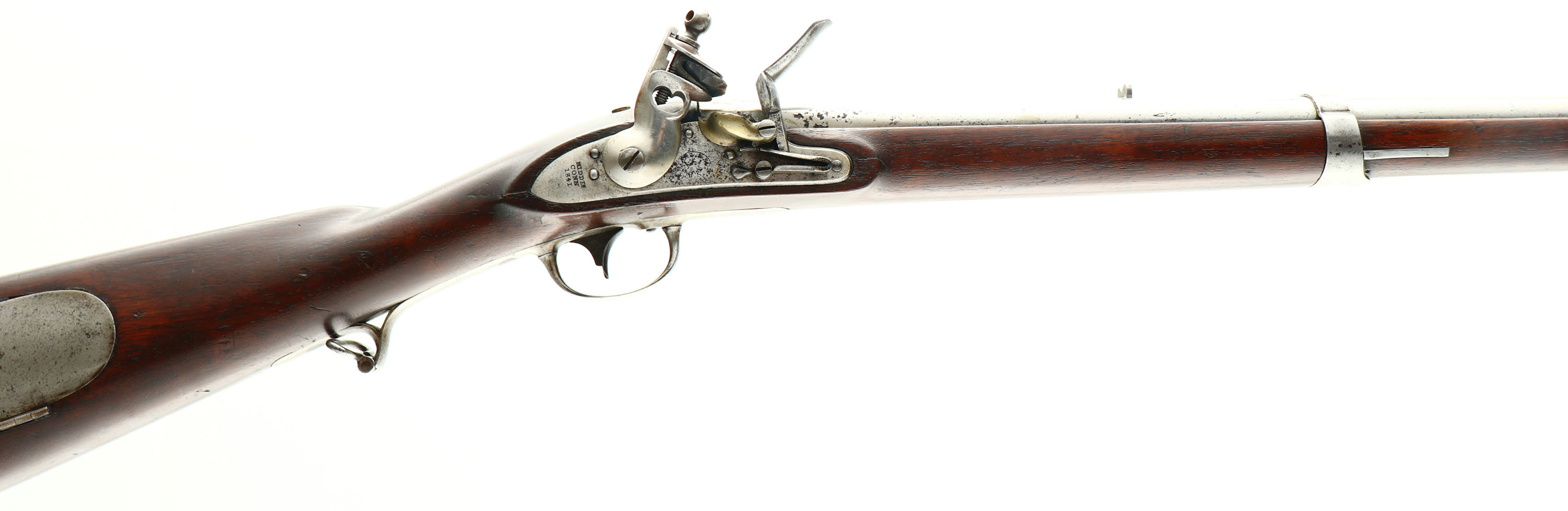 HISTORY: The story of the 1817 Rifle starts with the 1814 common rifle. The 1814 rifle designed by Robert T. Wickham & was produced by Henry Deringer of Philadelphia & R. Johnston of Connecticut. Wickham sent the pattern to Deringer with a contract for 1000 rifles. One of Deringer's rifles was then sent to R. Johnson to be duplicated, with a contract for 1000 more. The military liked these rifles & wanted more. They tweaked a few minor details & made up the 1817 common rifle. Harpers Ferry would produce a couple patterns of the weapon & send them out to multiple private contractors for them to copy & make. One of them was the Nathan Starr & Co. of Middleton Connecticut. They would make 10,200 total rifles from 1817-41. This rifle is from the contract of 1840 for 6000 rifles. These were some of the last flintlock guns made for the military as the US would soon adopt the Model 1841 Mississippi rifle, in 1841, that had a percussion lock & was rifled. Common rifle came from 1840 Ordnance Department records to differentiate between the muzzleloading rifles, & the breech loading Hall rifles. before this it was just called the 1817 rifle. Many of these rifles were converted to percussion, or left with the flintlock & used in the civil war. These were a lot higher value & more favored than many other flintlocks since they were rifled, not smoothbore. 5,000 US M1817 Rifles were in storage at the Benicia Arsenal in San Francisco in 1861, and many of these rifles were issued to the 1st California Volunteer Cavalry, who fought in the far western theater against Confederate forces in New Mexico and Arizona. Even as late as March of 1863, Common Rifles were showing up in Confederate arsenal inventories. This rifle has been bored to .62 Cal & made into a smoothbore, unknown when but it was mostly likely done after the Civil war by a gunsmith to fix a worn out bore.