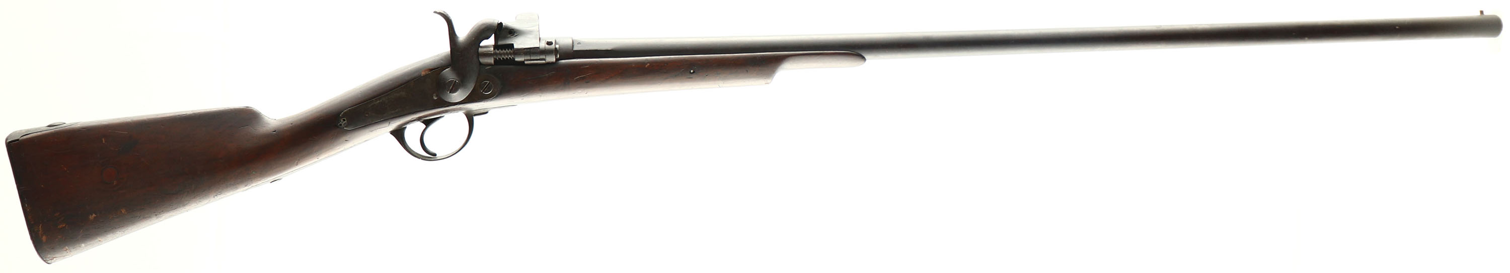 HISTORY: This started life as a French made Muzzleloader, either a MLE 1842 or a MLE 1853/57. It was then upgraded with the Tabariere breech loading system. invented in 1864, roughly 358,000 rifles had been converted by July of 1870, in time for the Franco-Prussian war where they were used by second line troops or in defensive roles since this weapon system was inferior to the Chassepot rifle. After the war they were sold to Belgium who converted them into very cheap shotguns, known today as ZULU guns. This was done in the late 1870s to the 1880s. large numbers of these would be bought by US importing companies & sold on the US hunting market as a cheaper alternative than the US made shotguns. Sometimes there were marked with trade names of ''ZULU'', or ''HUNTER''. These shotguns would cost 3-5 bucks where a US made pump action shotguns costed 15-20 bucks. This gun comes with a photocopy of a old Saxon ad from Harpers Weekley in 1881, that shows these guns being sold for $5.50