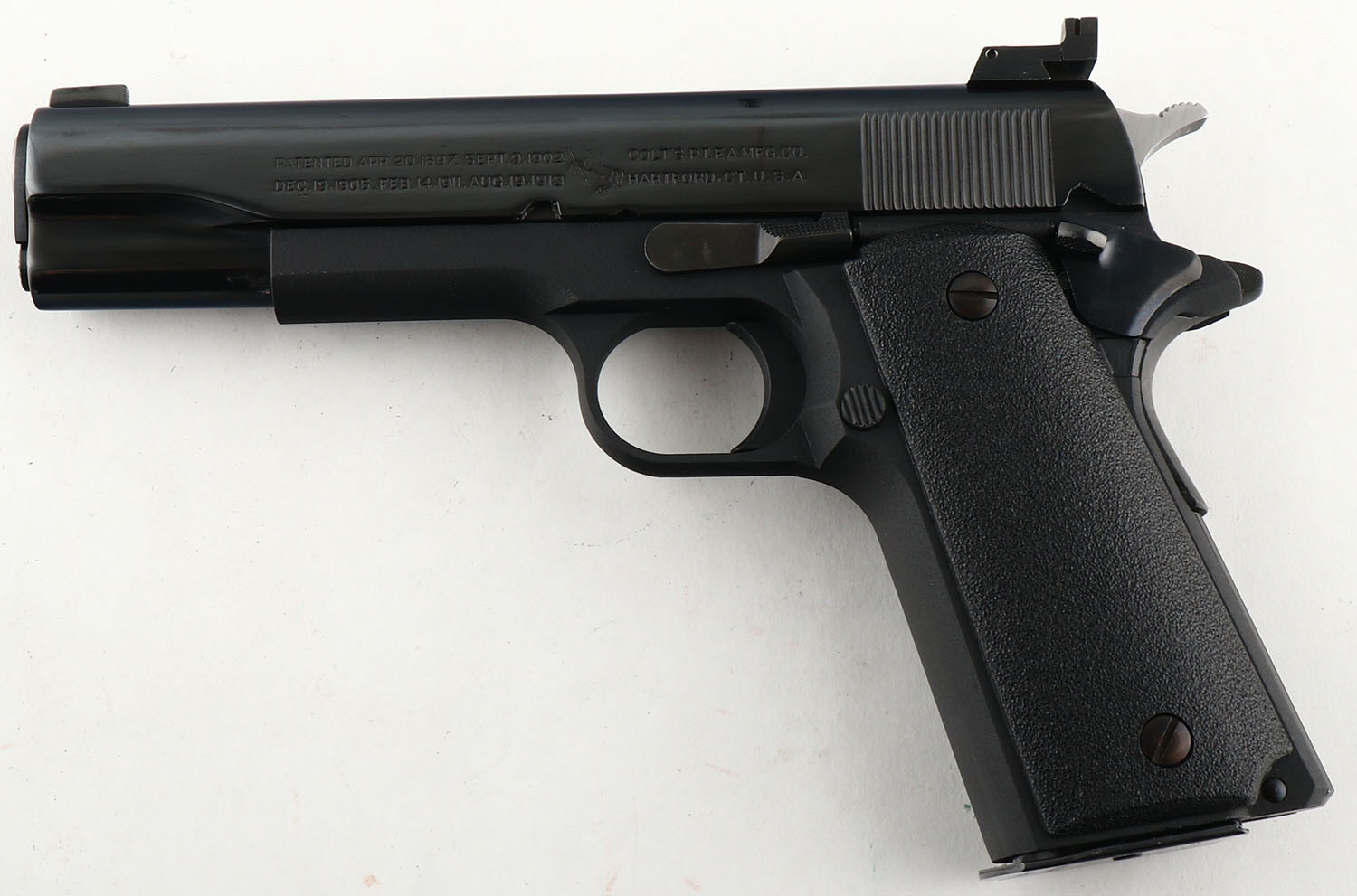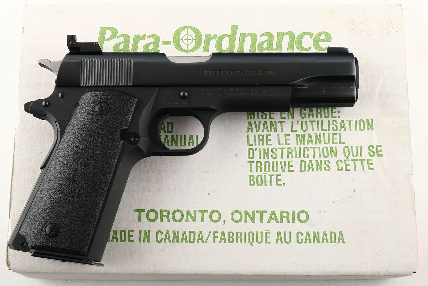 Para Ordnance/Colt, M1911 Double Stack, CAL: 45 ACP, MFG: Modern, SN: PG006912, Semi Auto Pistol, 5'' barrel. Standard factory markings on the slide & frame. This pistol is compiled of a Para-Ordnance frame & pre-A1 Colt 1911 slide. The textured plastic grips are excellent. The restored blued finish on the slide rates 98%. The matte finish on the frame is excellent. Bore is excellent. Adjustable rear sight & serrated blade front sight. Para double stack mag. Comes in Para factory box, with extra mag & related paperwork. FFL Req. - Value: 500 to 1000