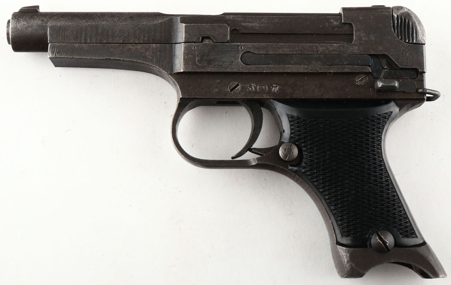 Nagoya, Nambu Type 94, CAL: 8x22 Nambu, MFG: 1944, SN: 49025, Semi Auto Pistol, 3 3/4'' barrel. Factory markings on the left & right side of frame. The original checkered plastic grips are excellent. There are minor nicks & dings to the edges. The original metal finish is good, with spotting throughout, toned to a brown patina. Bore is good, with roughness & intermittent spotting. Fixed square notch rear sight & blade front sight. No magazine. FFL or C&R Req. - Value: 250 to 450