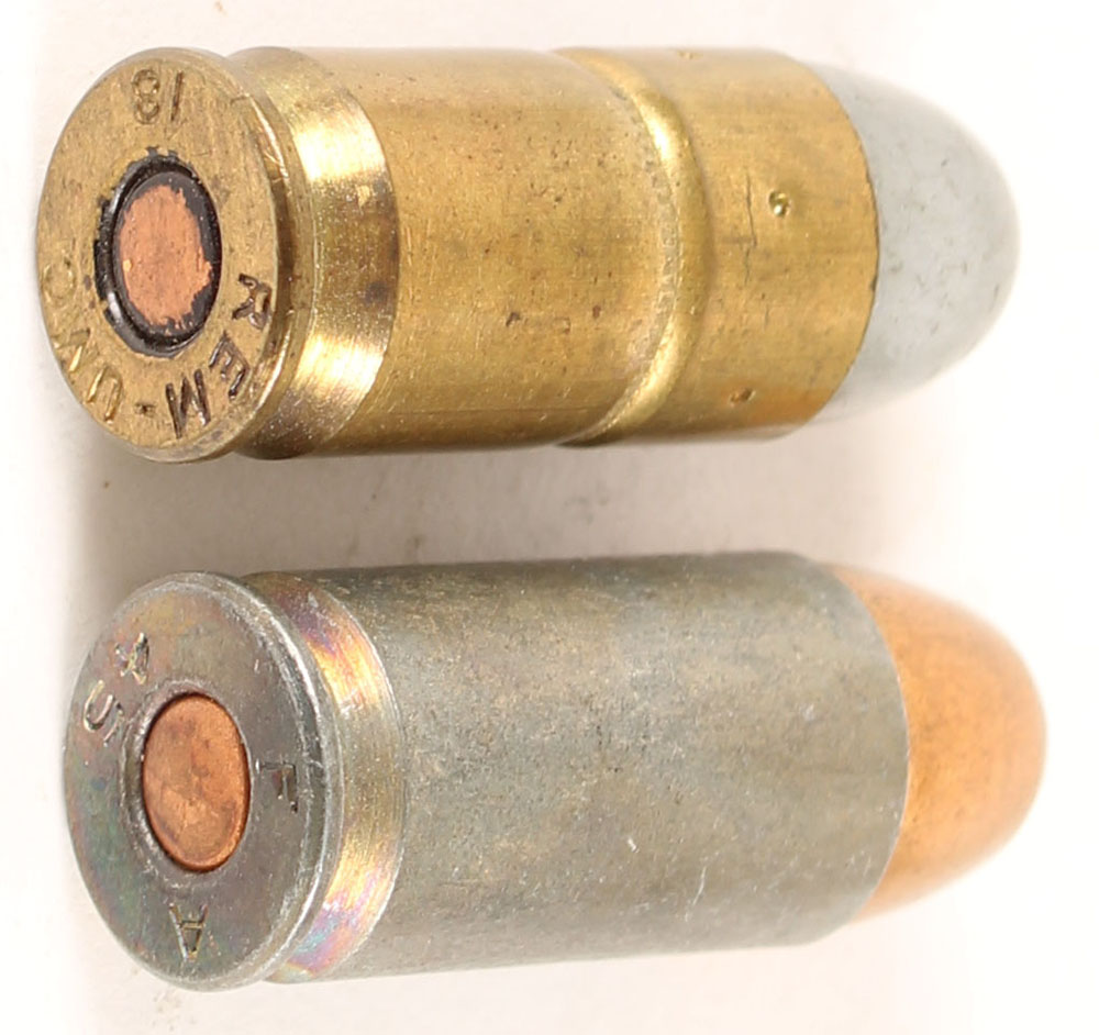 | Lot of 2, (1) .45 ACP, Helmet Test, F A 45, rounded copper prime...