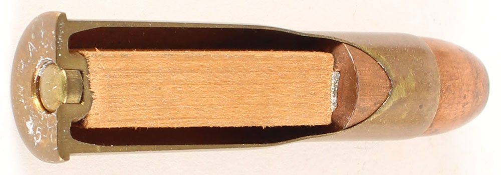 SCARCE H/S: W.R.A.Co. 45-75 WCF, round Br. Pri, case is cut half way with wood spacer rod. Grade: Excellent + - Value: 30 to 120