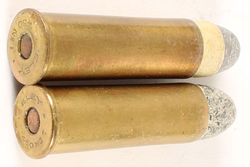 Lot of 2. .450 #1 Carbine (1.5'' case). HS:''ELEY .450 No 1'', (1) RN PP Lead with copper tube. (1) RN Lead with copper tube. Grade Very Good ++ - Value: 20 to 80
