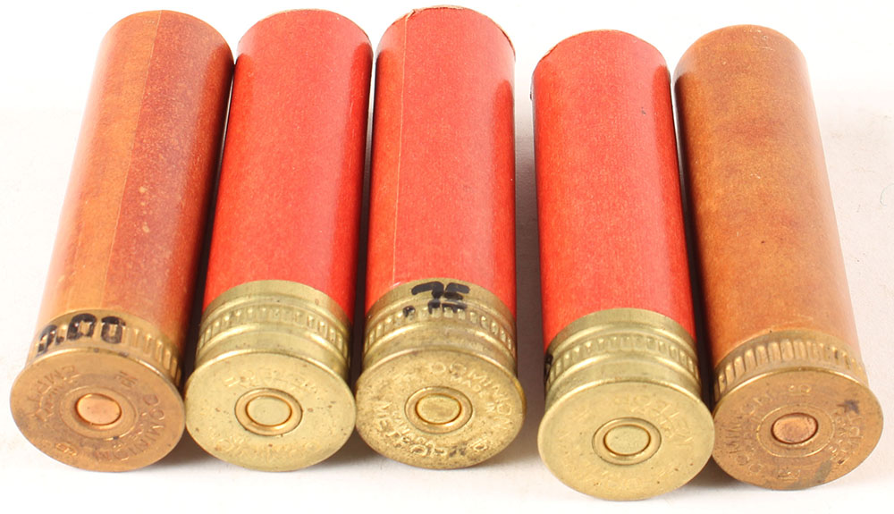 Lot of 5, Dominion Cart. Co., Empty 16ga., red paper shotshells, (3) H/S: ''Dominion Canada Meteor No 16''. (2) H/S: Dominion Canada Empty No. 16'', 2 1/2'' OAL. Grade: Excellent + - Value: 6 to 50