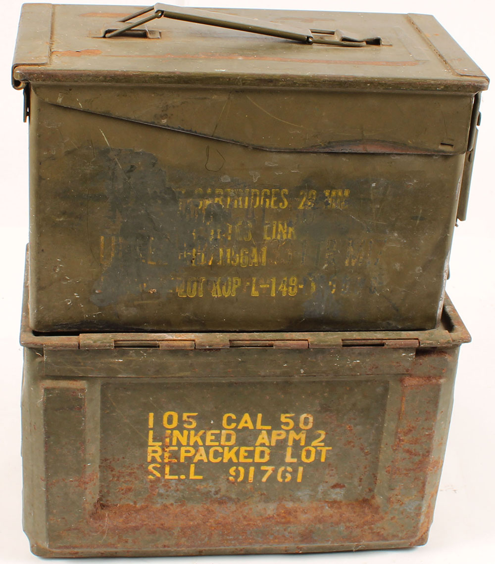 Lot of two .50 cal ammo cans, one older side opening can, 0ne newer end opening can, the oder can has light rust insdie, newer can has no ruist on the inside. Grade: Very Good - Value: 20 to 40